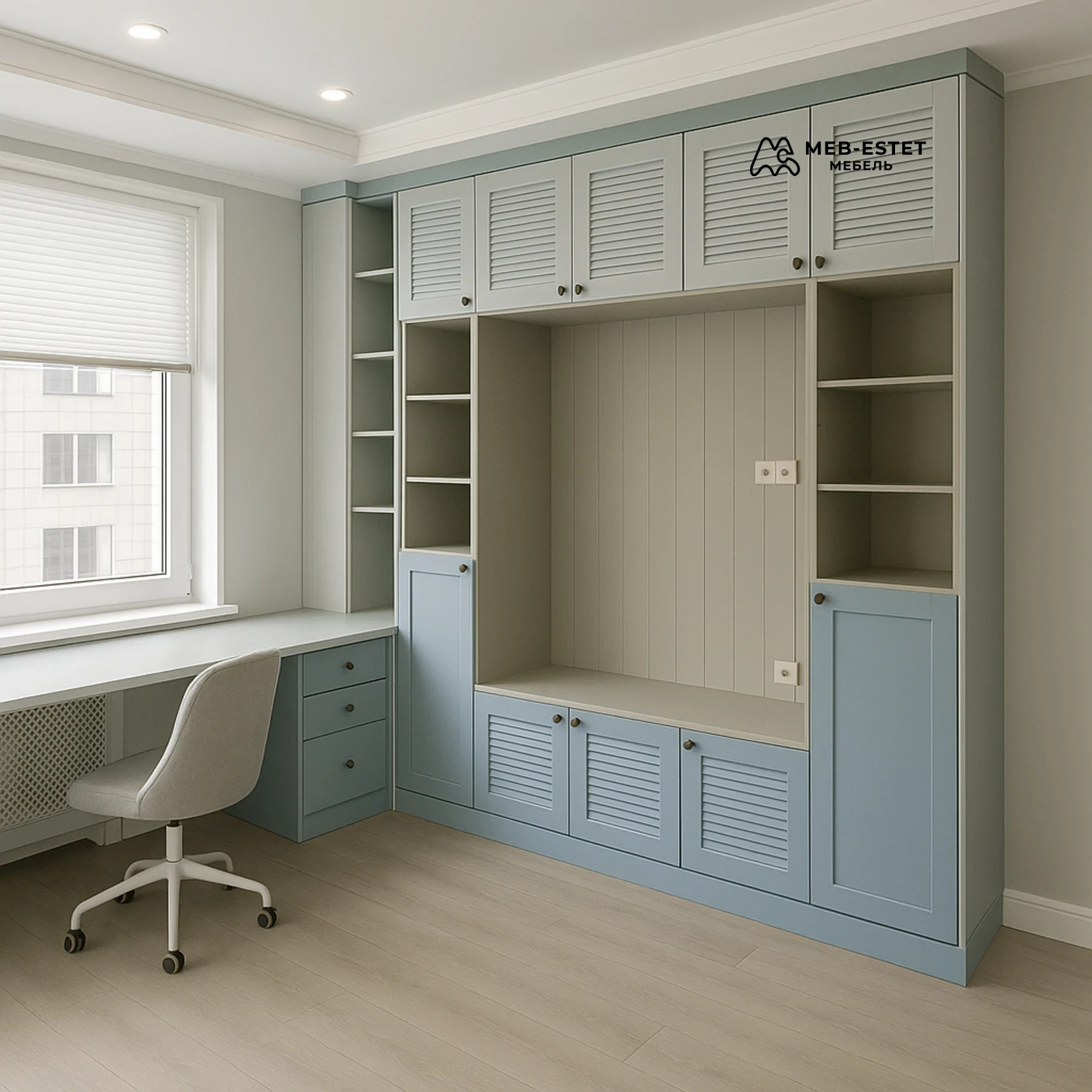 Встроенная стеллажная стенка с рабочей зоной — функциональное решение под индивидуальные размеры для кабинета или спальни. Лаконичные жалюзийные фасады сочетаются с открытыми полками и низкими тумбами, образуя комфортную нишу для сидения или техники.