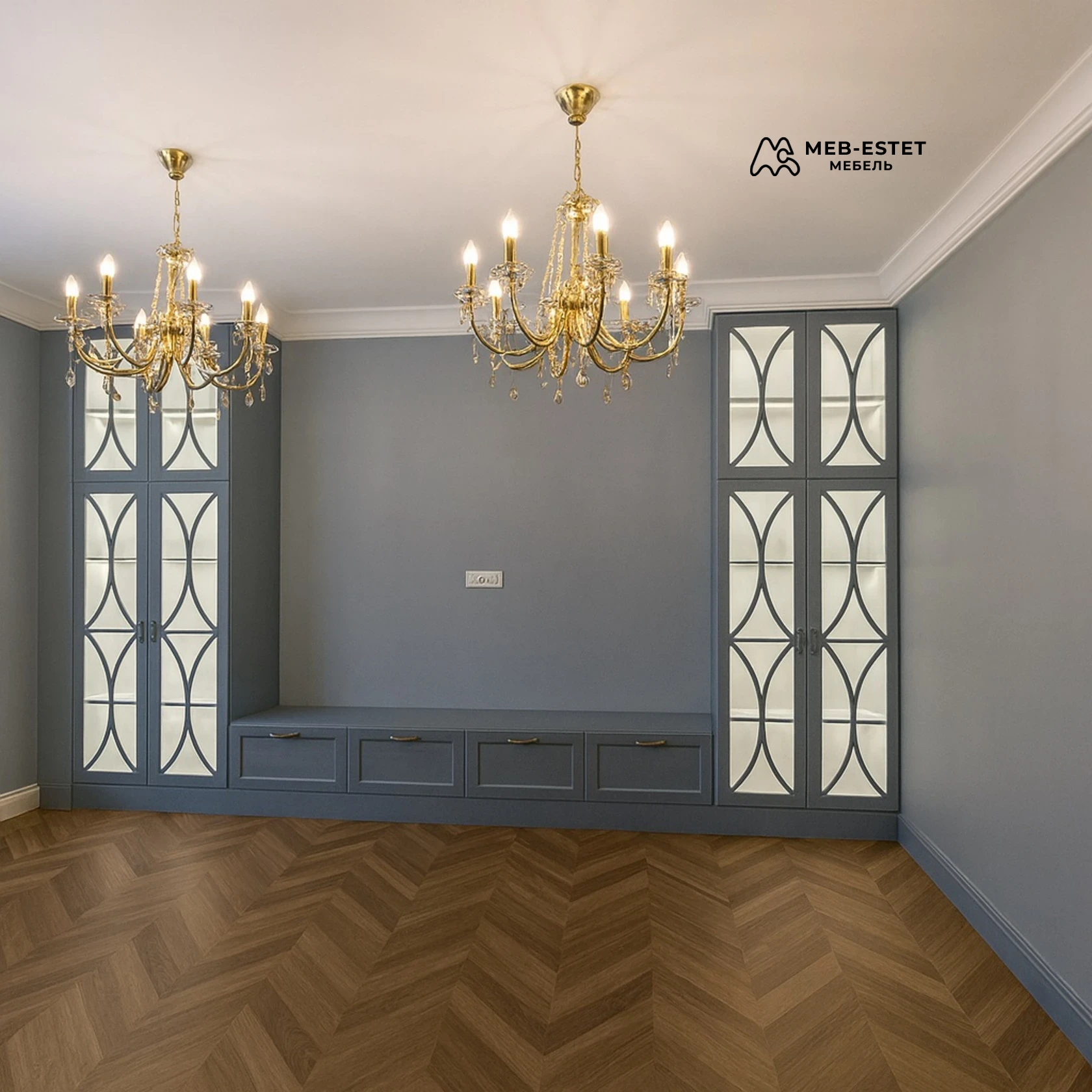 Элегантная корпусная стенка премиум-класса с симметричными витринами и низкой тумбой под ТВ. Изготовлена под индивидуальные размеры, идеальна для гостиной или прихожей.