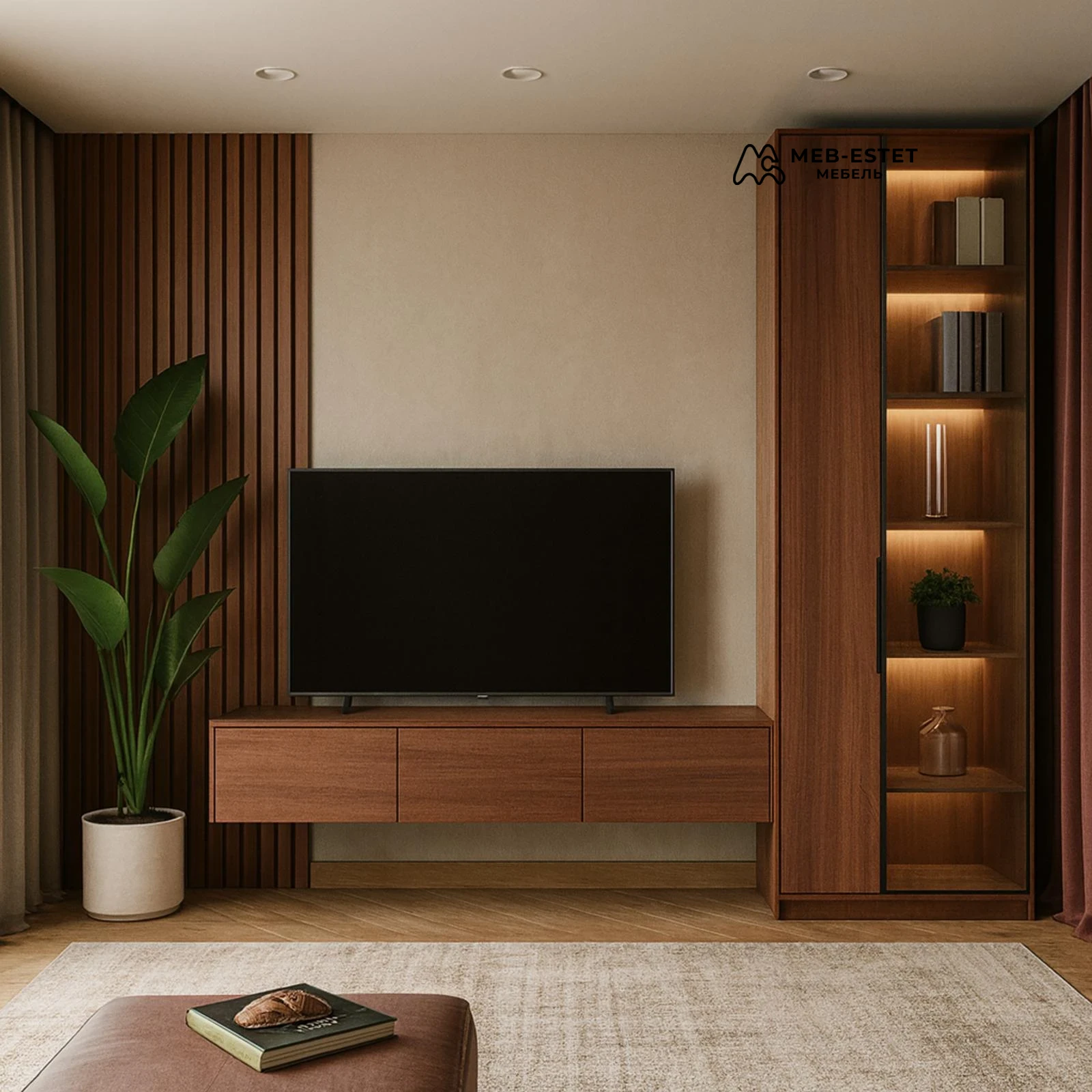 Элегантная модульная стенка под TV в тёплом деревянном оттенке. Состоит из подвесной тумбы с тремя выдвижными ящиками и высокой витрины со стеклянной дверью и встроенной подсветкой.