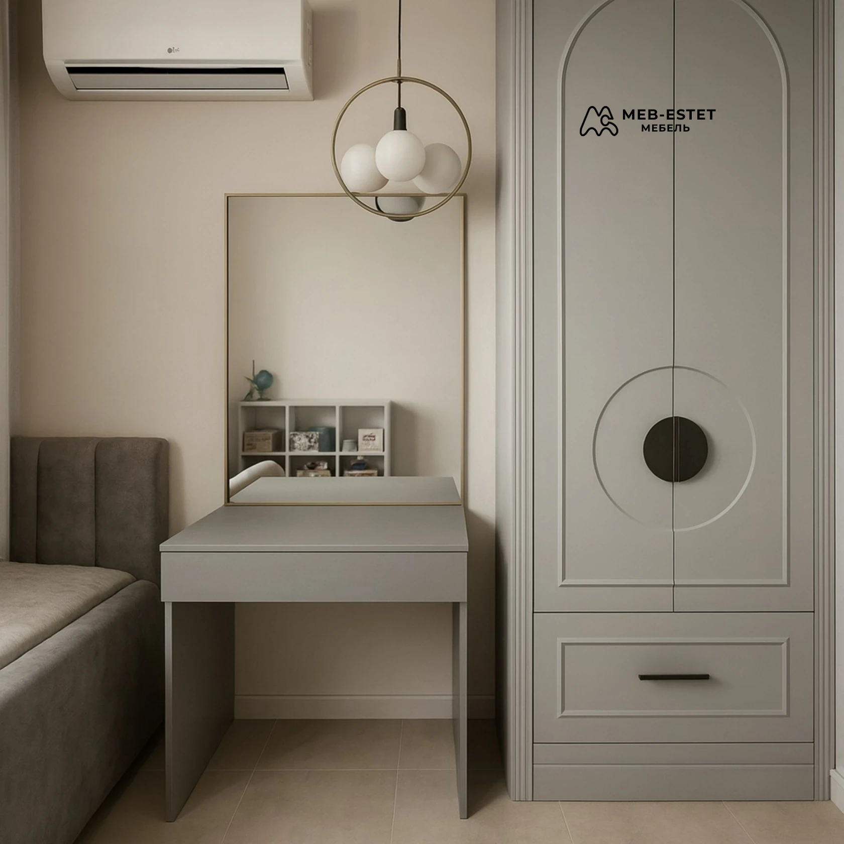 Компактная прикроватная зона: распашной шкаф и прилегающий туалетный столик в неоклассическом ключе. Фасады — фрезерованная МДФ с матовой эмалью, декоративный круговой мотив и выдвижной ящик для аксессуаров. Шкаф рассчитан на одежду и бельё, столик — для косметики и утренних сборов.