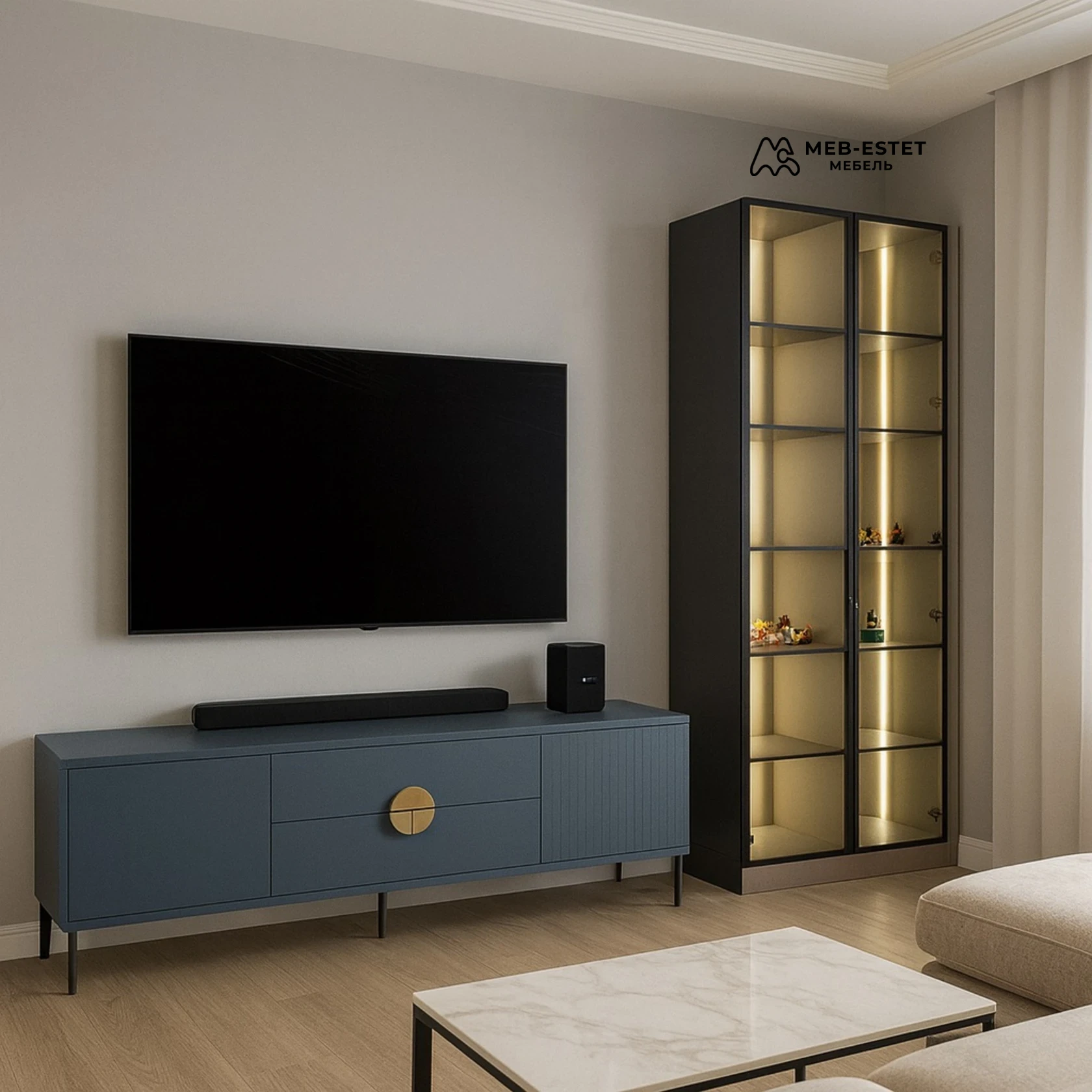 Комплект для гостиной: низкая тумба под ТВ в матовом синем лаке и высокая витрина с алюминиевой рамой и стеклянными дверцами. Выполнен с акцентом на премиум‑фурнитуру: доводчики, регулируемые полки, скрытая прокладка кабелей и встроенная вертикальная LED-подсветка.