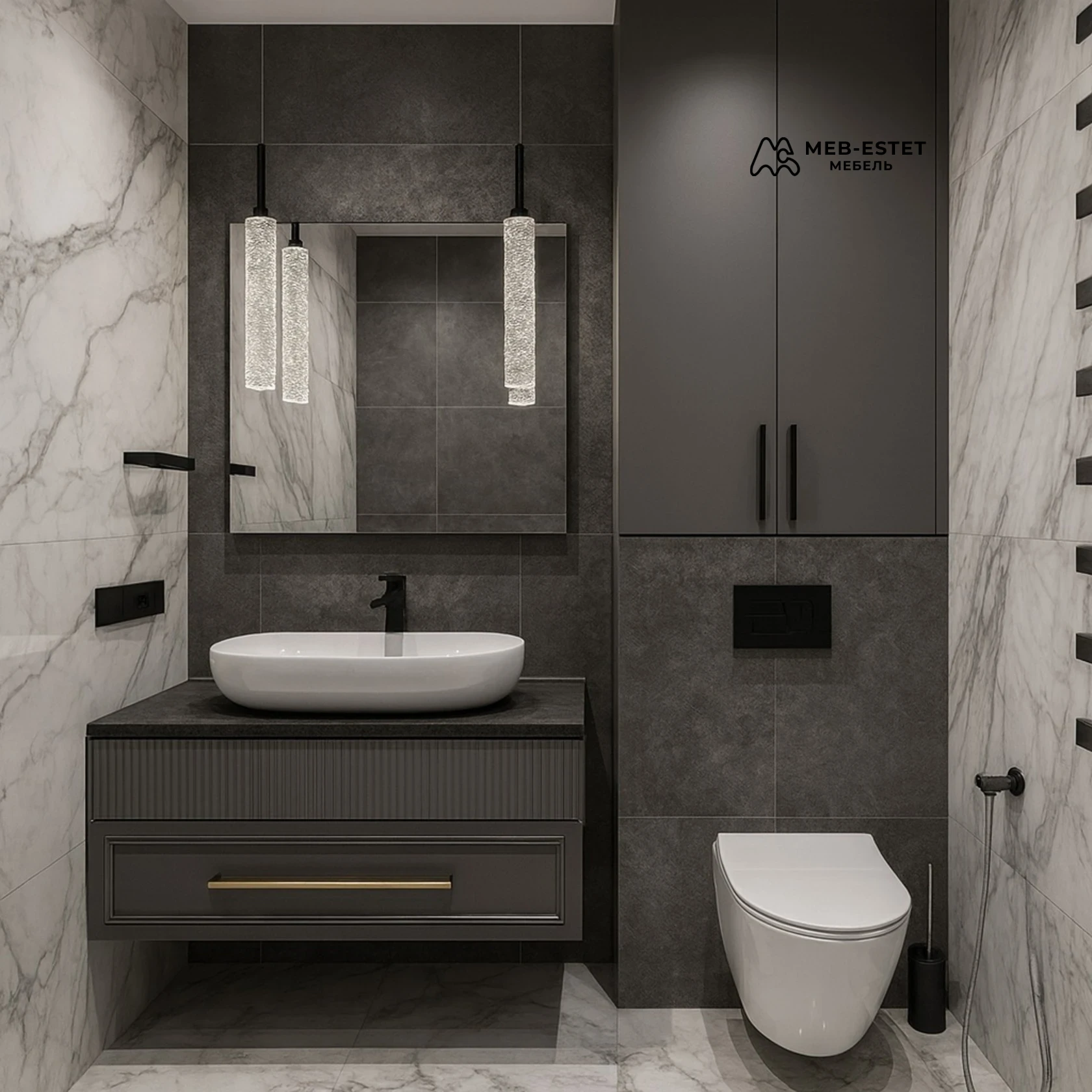 Подвесная тумба под умывальник премиум-класса в матовом графитовом оттенке. Конструкция сочетает реечную фрезерованную фасадную панель и глубокий выдвижной ящик с аккуратной металлической ручкой, обеспечивая удобный доступ к косметике и гигиеническим принадлежностям.