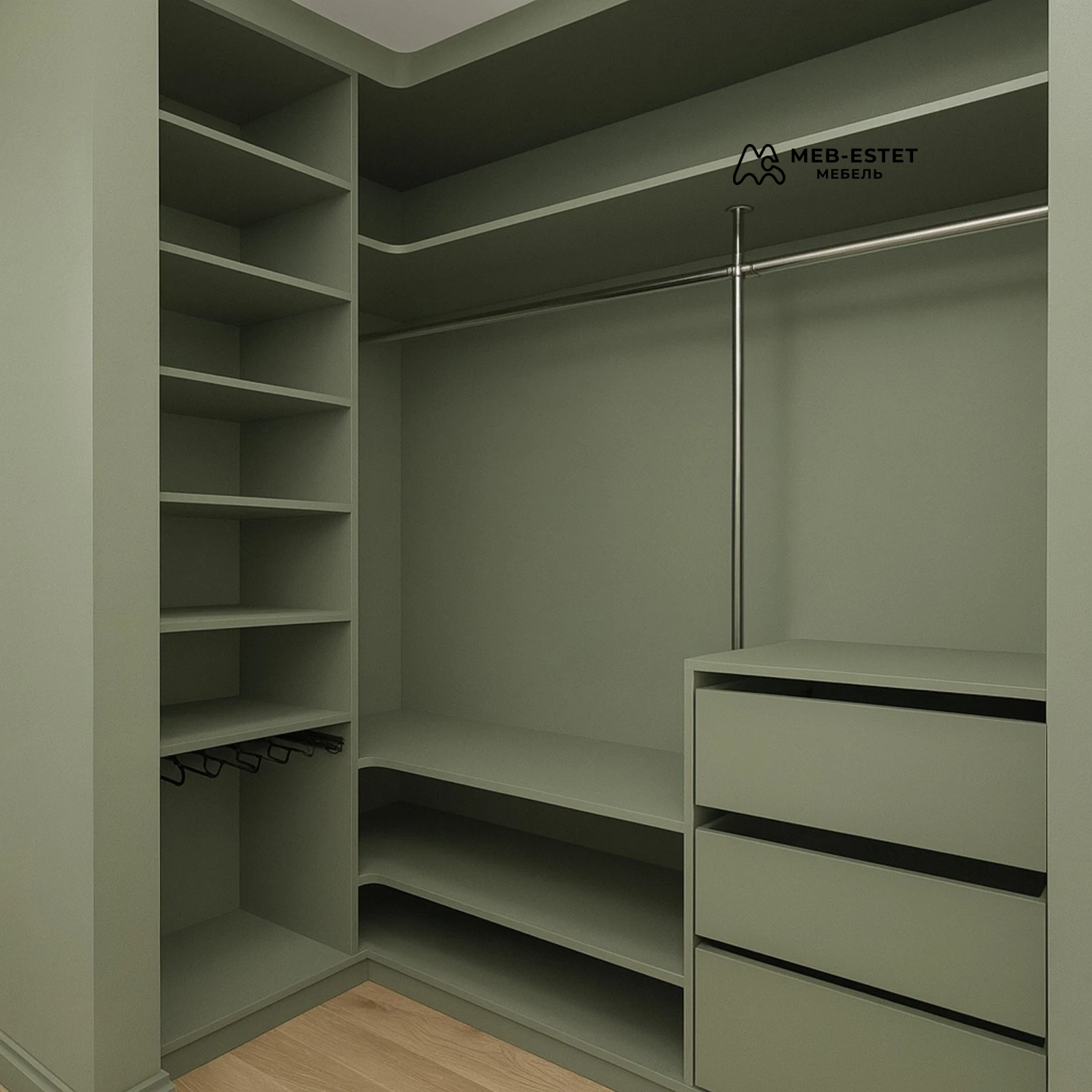 Функциональная угловая гардеробная под индивидуальный размер, выполнена в матовом зелёном тоне. Конструкция предусматривает выдвижные ящики с интегрированными ручками, открытые полки для обуви и аксессуаров, а также прочную штангу с вертикальной стойкой для длинных вещей.