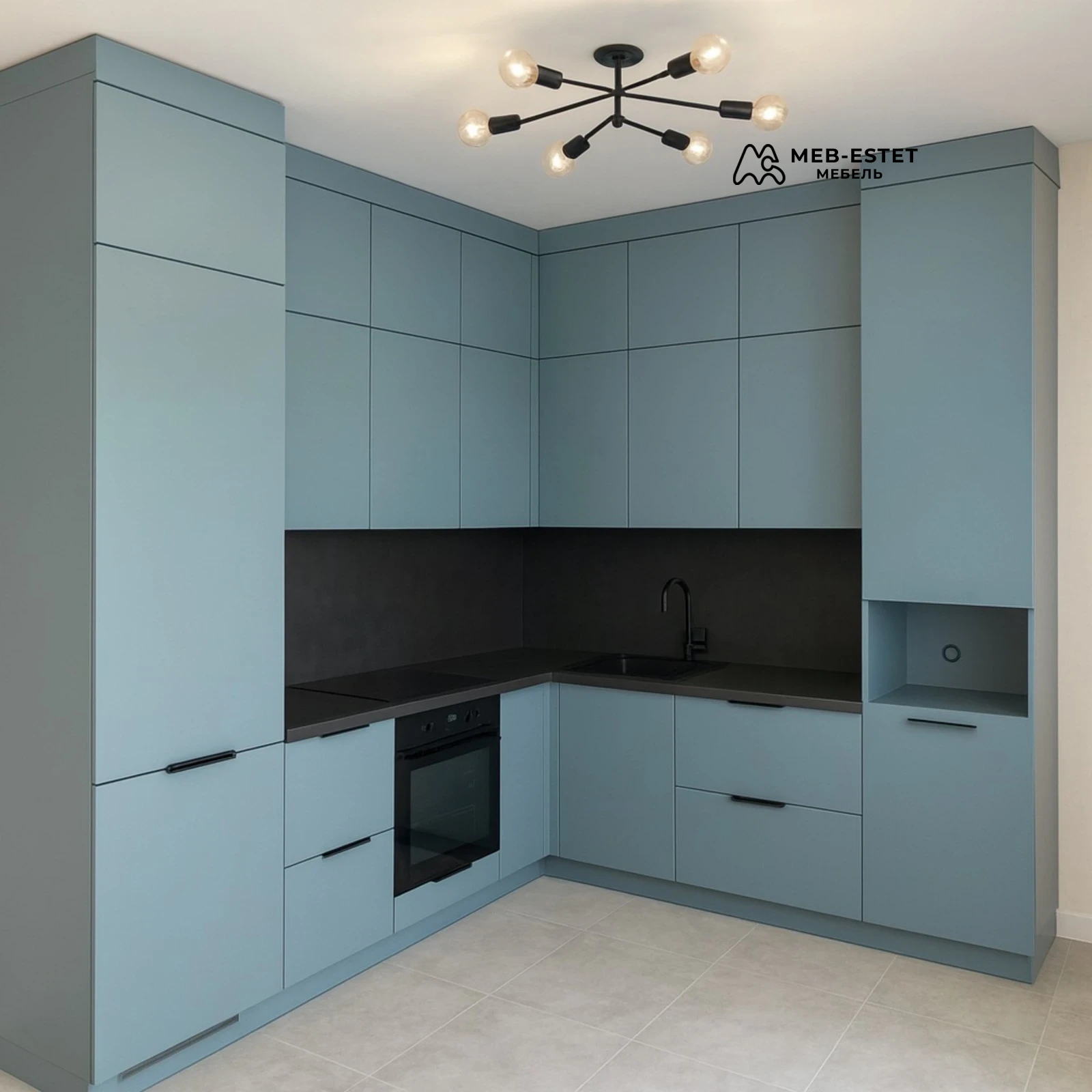 Современная угловая кухня в спокойном пастельно-синем оттенке, выполнена с фокусом на премиум-качество и эргономику. Корпус из ЛДСП/МДФ, матовые фасады с эмалью или матовой пленкой, интегрированные алюминиевые ручки и аккуратные скрытые петли.