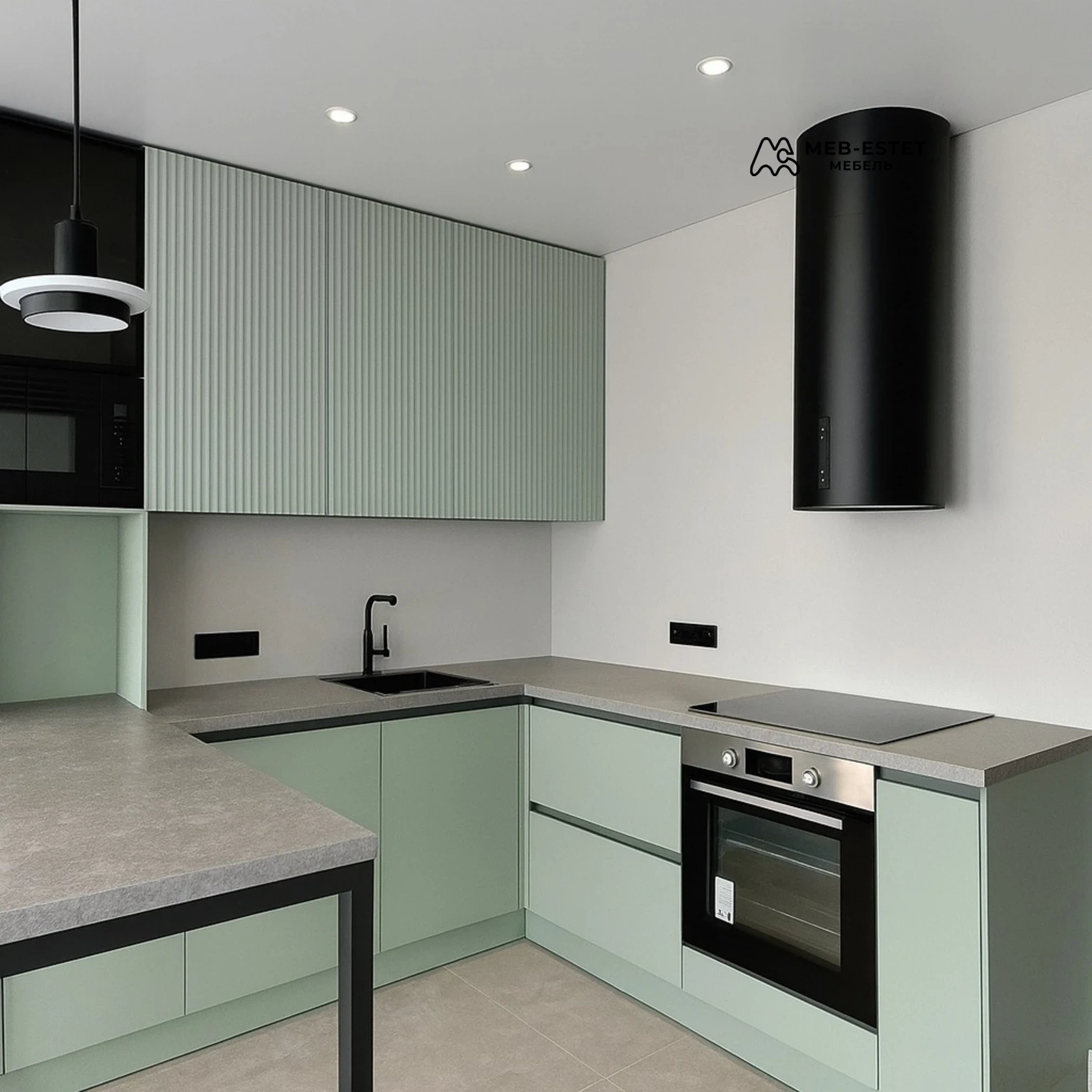 Угловая кухня, выполненная по индивидуальным размерам, сочетает премиальное качество и лаконичный дизайн. Фасады — МДФ с реечной текстурой и матовым покрытием, столешница — серый камень, стойкий к механическим нагрузкам. Чёрная встроенная техника и аккуратная встроенная мойка подчёркивают современный облик.
