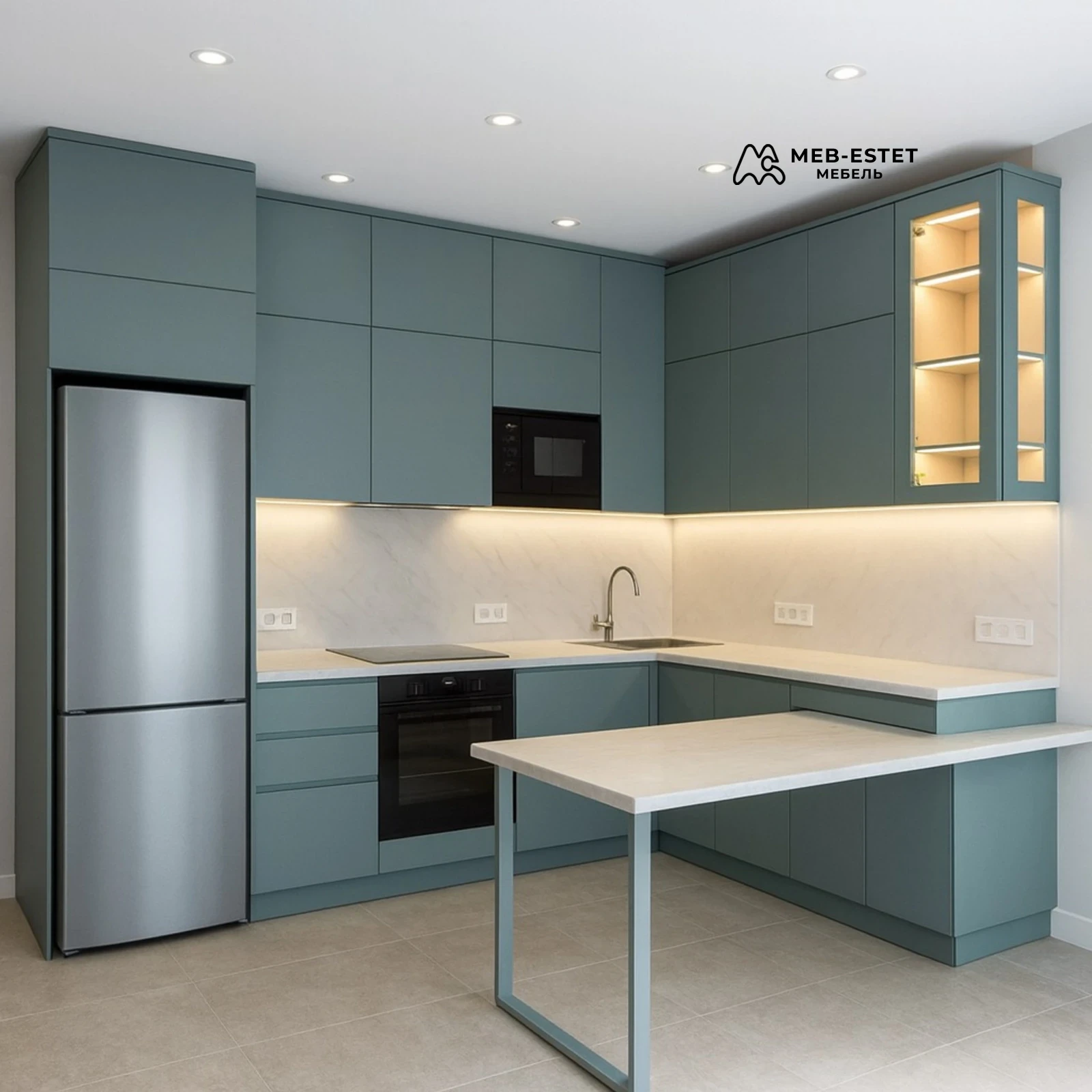 Современная угловая кухня в матовом зелёном оттенке, выполненная по индивидуальным размерам. Плоские МДФ фасады без ручек, встроенная ниша под холодильник и духовой шкаф, стеклянная витрина с подсветкой.