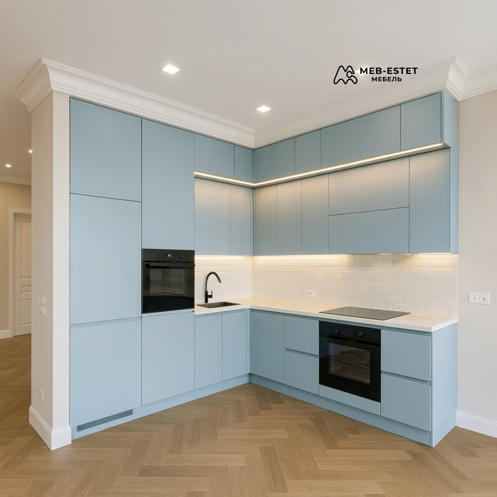 Лаконичная угловая кухня на заказ в пастельно-голубом цвете. Плоские фасады без ручек, интегрированный профиль для открывания, скрытые петли с доводчиками и мягким закрыванием. Рабочая поверхность из светлого кварца и светодиодная подсветка плинтуса и нижней кромки верхних шкафов обеспечивают равномерное освещение рабочей зоны.