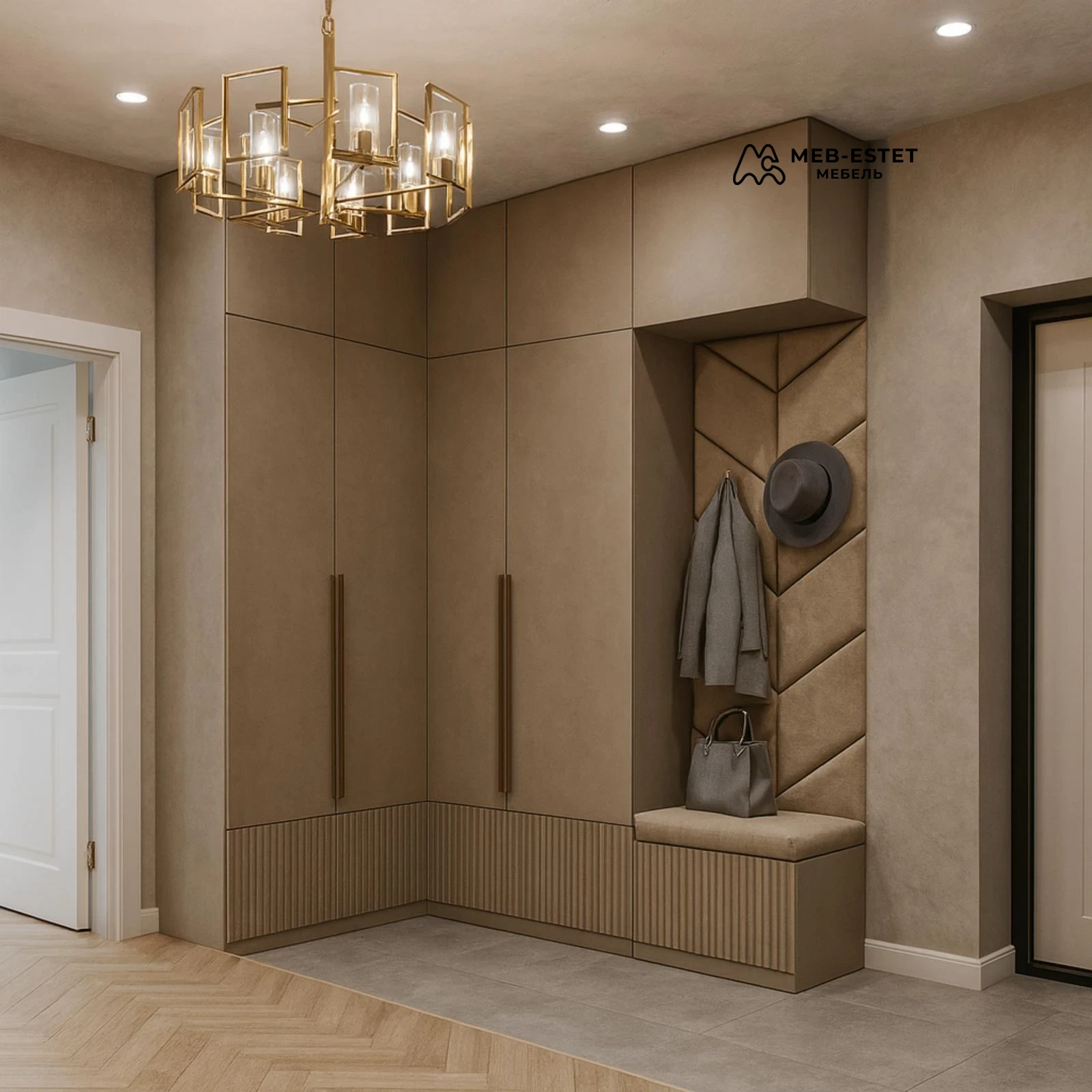 Угловая встроенная прихожая премиум-класса с банкеткой и мягкой декоративной панелью. Изделие выполнено под потолок, включает антресоли и глубокие шкафы для верхней одежды.