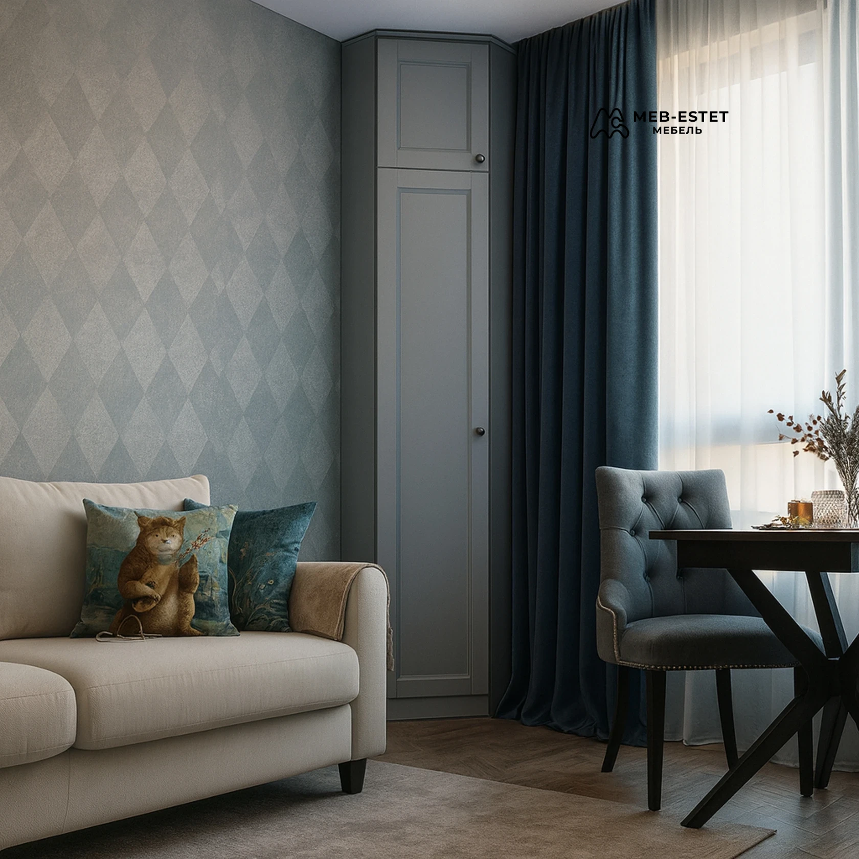 Угловой встроенный пенал на заказ — элегантное и функциональное решение для гостиной. Корпус и фасады из МДФ с матовой покраской, филёнчатая дверь с тонкой фрезеровкой и лаконичными ручками создают премиальный вид. Внутри — полки и антресоль для хранения.