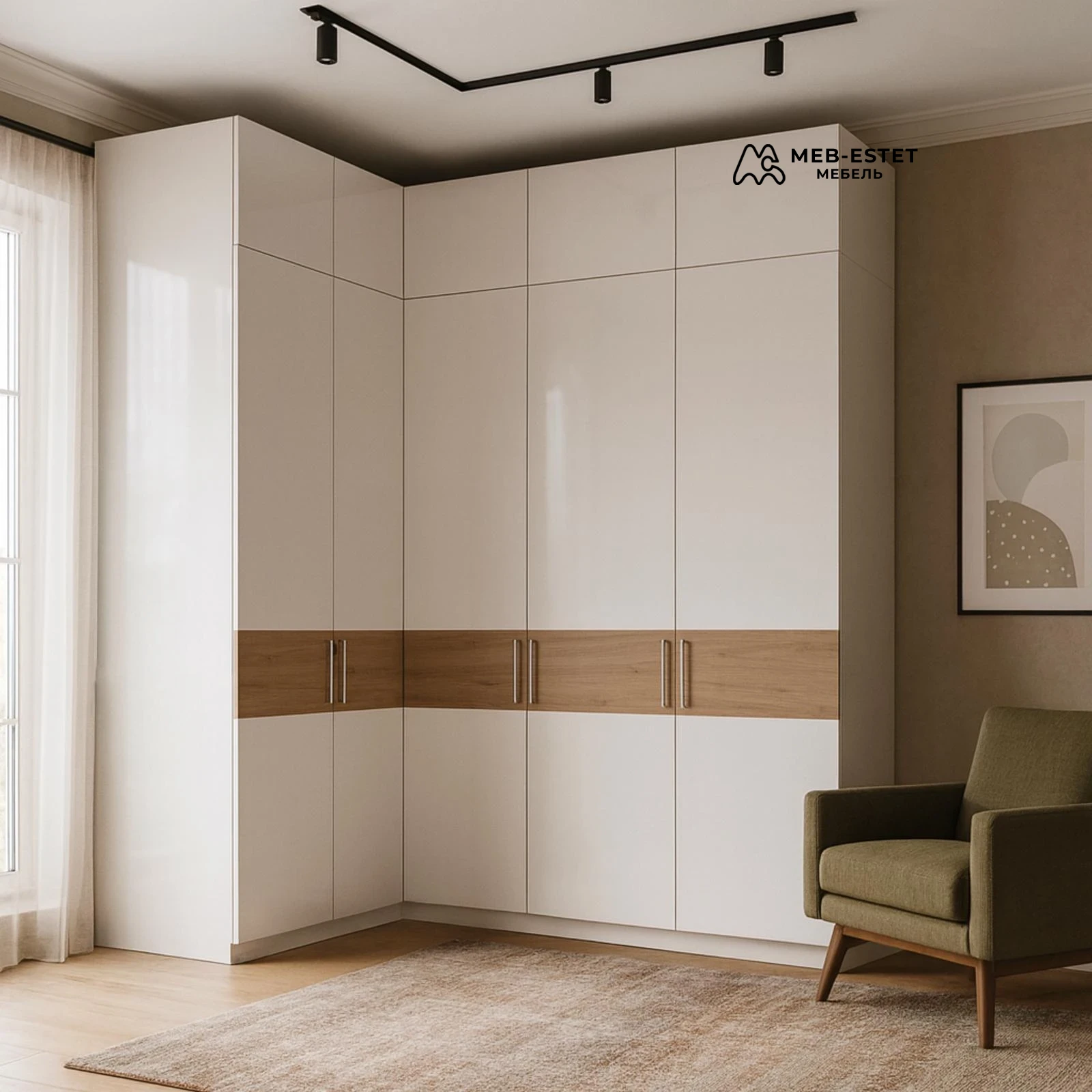 Угловой распашной шкаф премиум-класса в скандинавском ключе. Белые глянцевые фасады сочетаются с тёплой деревянной вставкой из шпона и аккуратными вертикальными металлическими ручками. Корпус умещается до потолка, что даёт максимум места для хранения.
