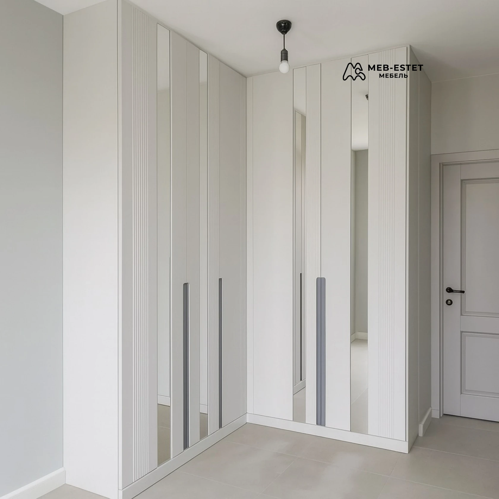 Встроенный угловой шкаф премиум-класса для прихожей — лаконичное решение под индивидуальный проём. Выполнен из крашеного МДФ с зеркальными вставками и вертикальной реечкой, подходит для плотной эксплуатации и узких коридоров.