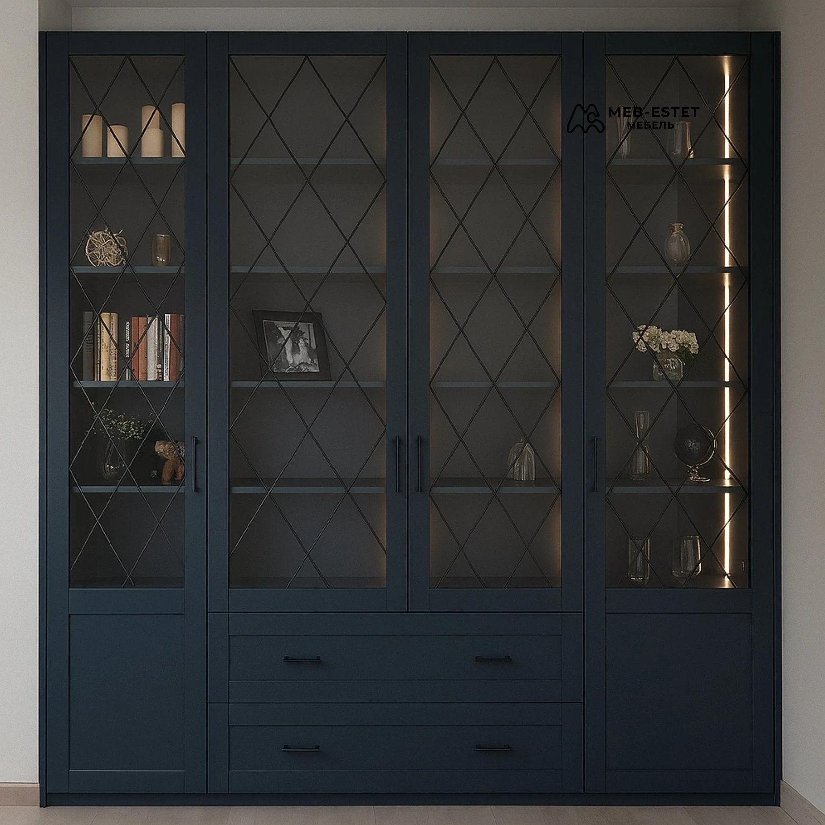 Элегантная витрина на заказ — премиальное решение для гостиной или библиотеки. Каркас и фасады из МДФ с матовой полимерной отделкой глубокого синего цвета, строгая ромбическая решётка на стеклах и тонкая алюминиевая фурнитура подчеркивают классический силуэт в современной интерпретации.