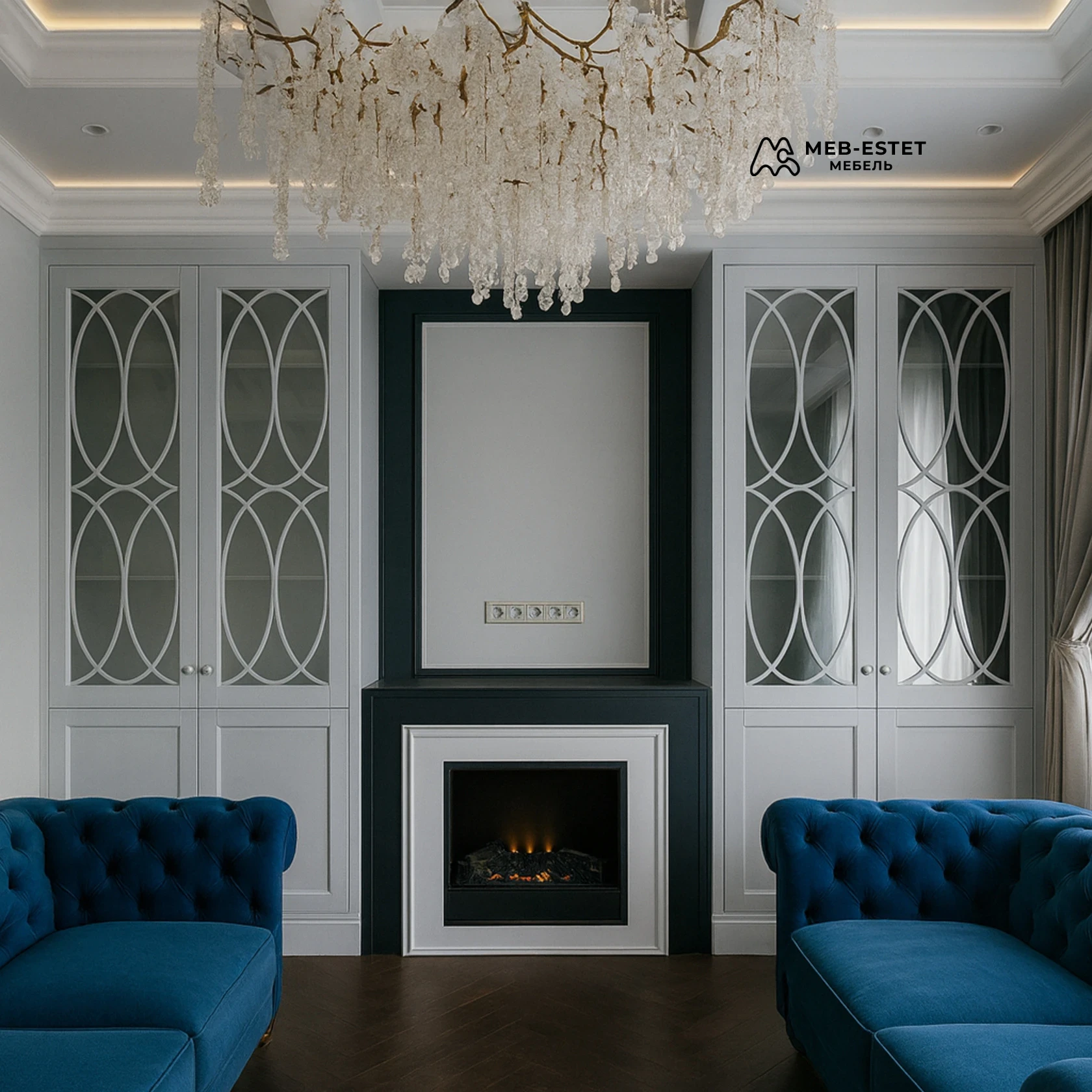 Настенная мебель вокруг камина — индивидуальная система хранения и демонстрации предметов интерьера. Корпус и двери выполнены в классическом стиле с декоративными перекладинами и стеклянными вставками. Возможна покраска в любой цвет, регулировка внутренней компоновки полок и интеграция подсветки.