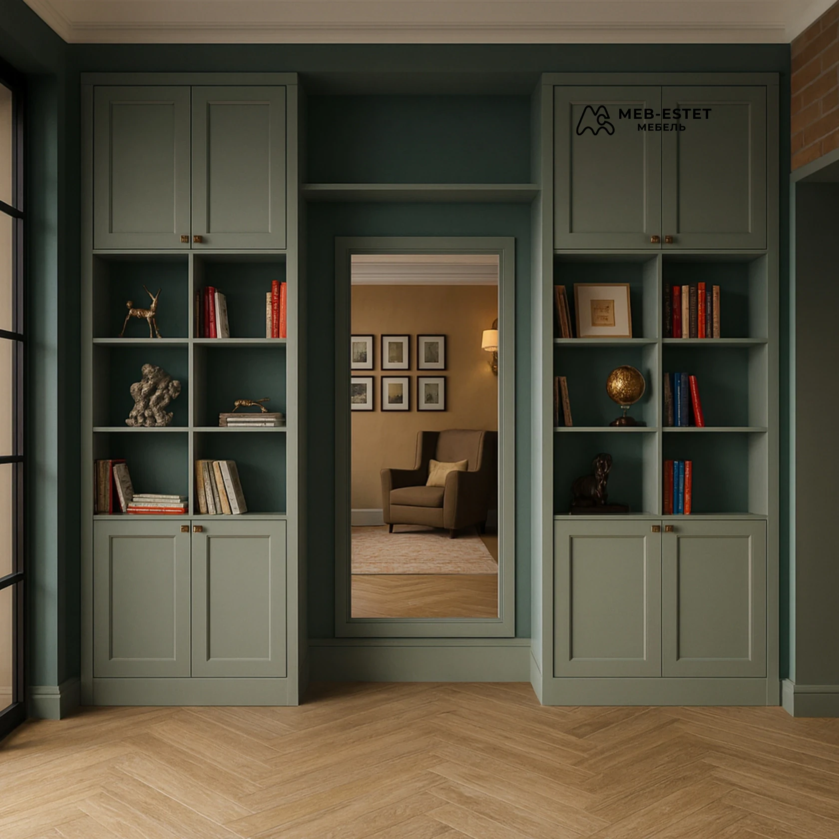 Встроенная библиотека в матовом зелёном оттенке с рамочными фасадами и открытыми полками. Симметричная композиция вокруг прохода/зеркала создает аккуратный визуальный центр и обеспечивает удобный доступ к книгам и декоративным элементам.