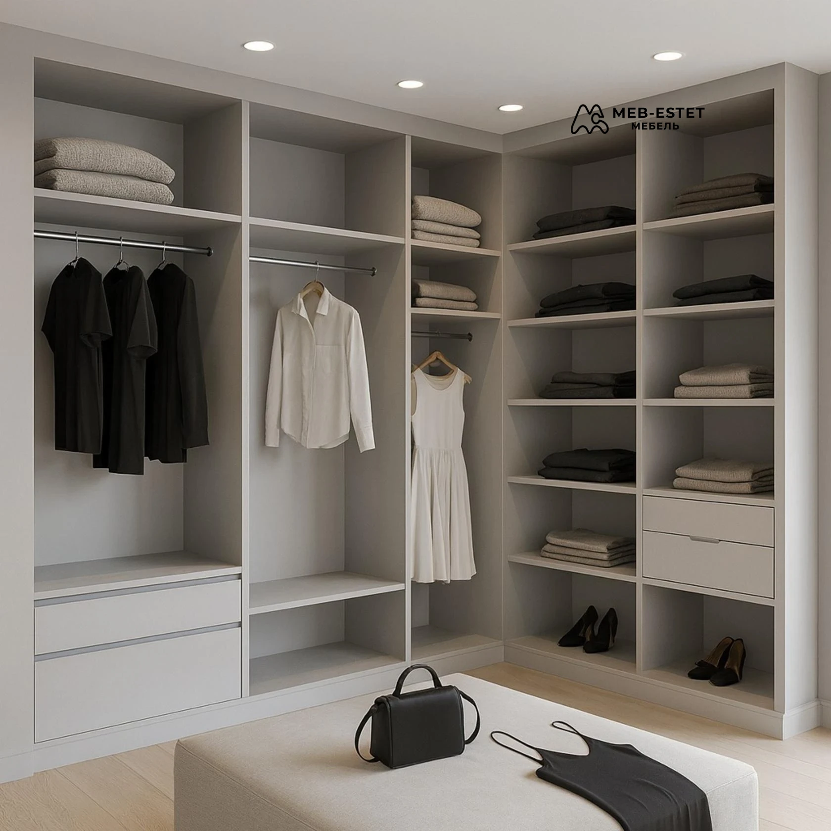 Современная встроенная гардеробная с открытыми модулями — идеальное решение для организованного хранения. Место для длинных и коротких вещей, удобные полки и ящики для аксессуаров, ниши для обуви.