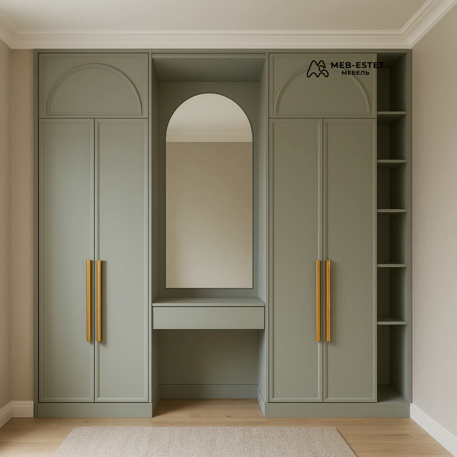 Элегантная встроенная гардеробная с центральной туалетной нишей и арочным зеркалом. Фасады выполнены из МДФ с матовой эмалевой покраской, декоративная фрезеровка придаёт неоклассический характер. Внутреннее наполнение рационально: штанги, полки, выдвижной ящик под столиком и открытые секции для аксессуаров.