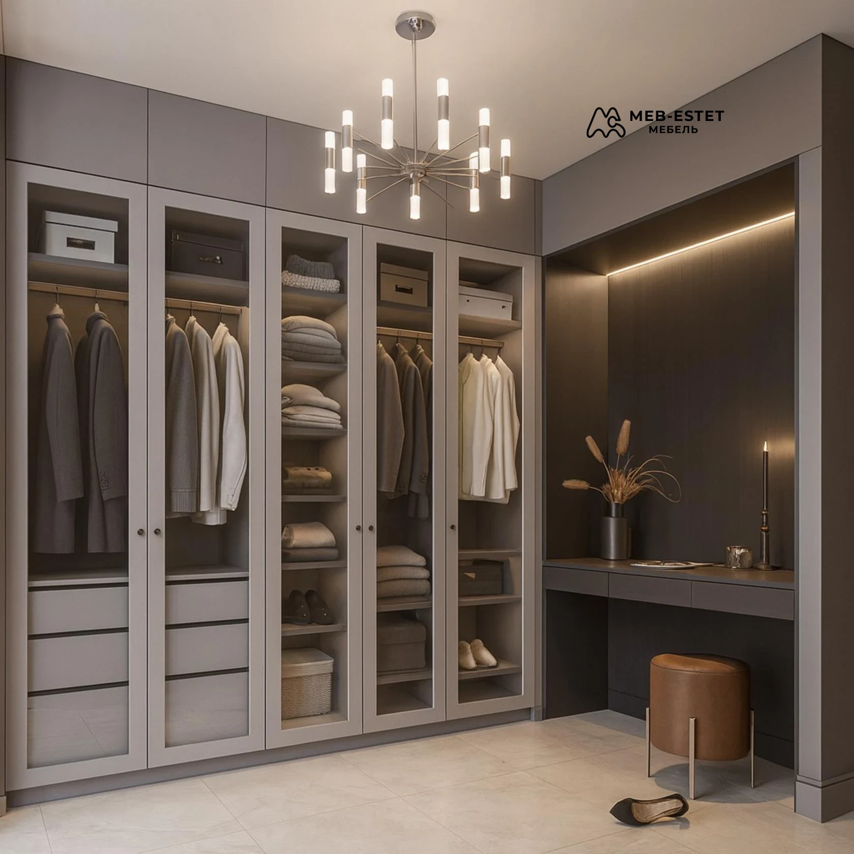 Элегантная встроенная гардеробная премиум-класса с боковой рабочей нишей. Каркас и фасады выполнены из МДФ с матовой отделкой и стеклянными вставками, встроенная подсветка подчёркивает профиль и упрощает поиск вещей.
