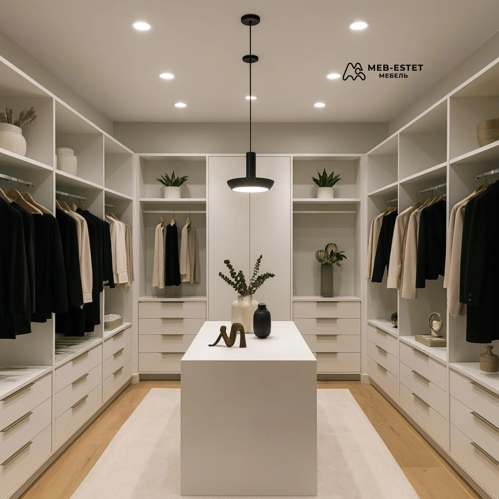 Современная встроенная гардеробная премиум-класса с центральным островом — решение для тех, кто ценит порядок и эстетику. Открытые секции для повседневной одежды, штанги для вешалок, глубокие выдвижные ящики и антресоли обеспечивают продуманное хранение.