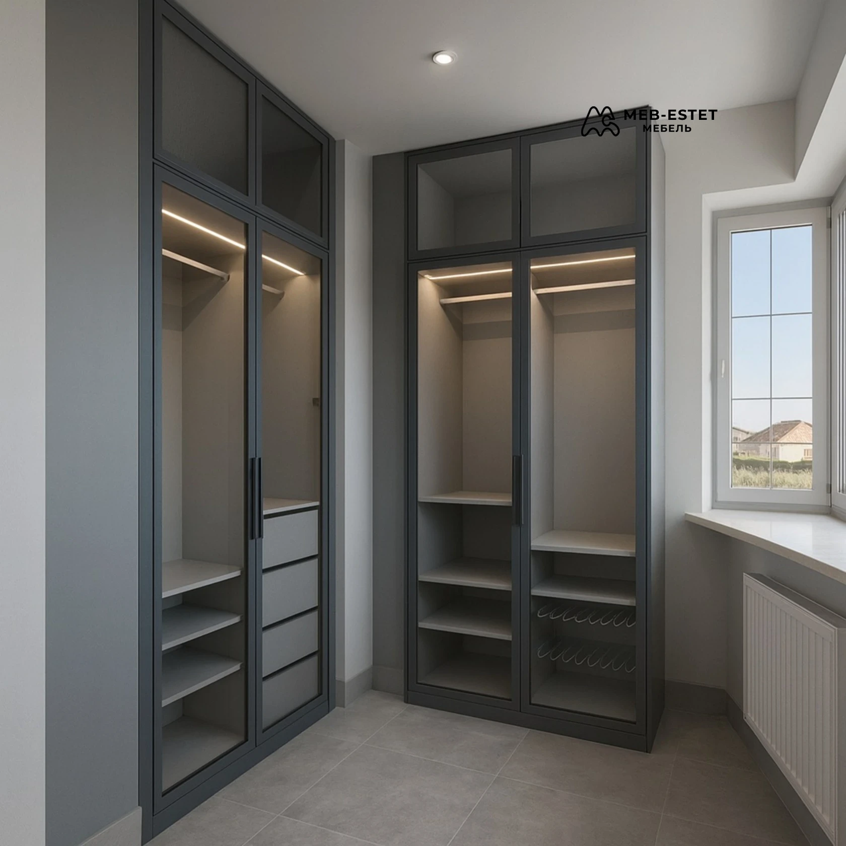 Узкая встроенная гардеробная премиум-класса с рамными стеклянными фасадами и внутренней подсветкой. Выполняется под индивидуальные размеры, с вместительными полками, выкатными ящиками и штангой для одежды. Конструкция продумана с точки зрения технологии — вентиляция корпуса, регулировка полок и качественная фурнитура для мягкого закрывания.