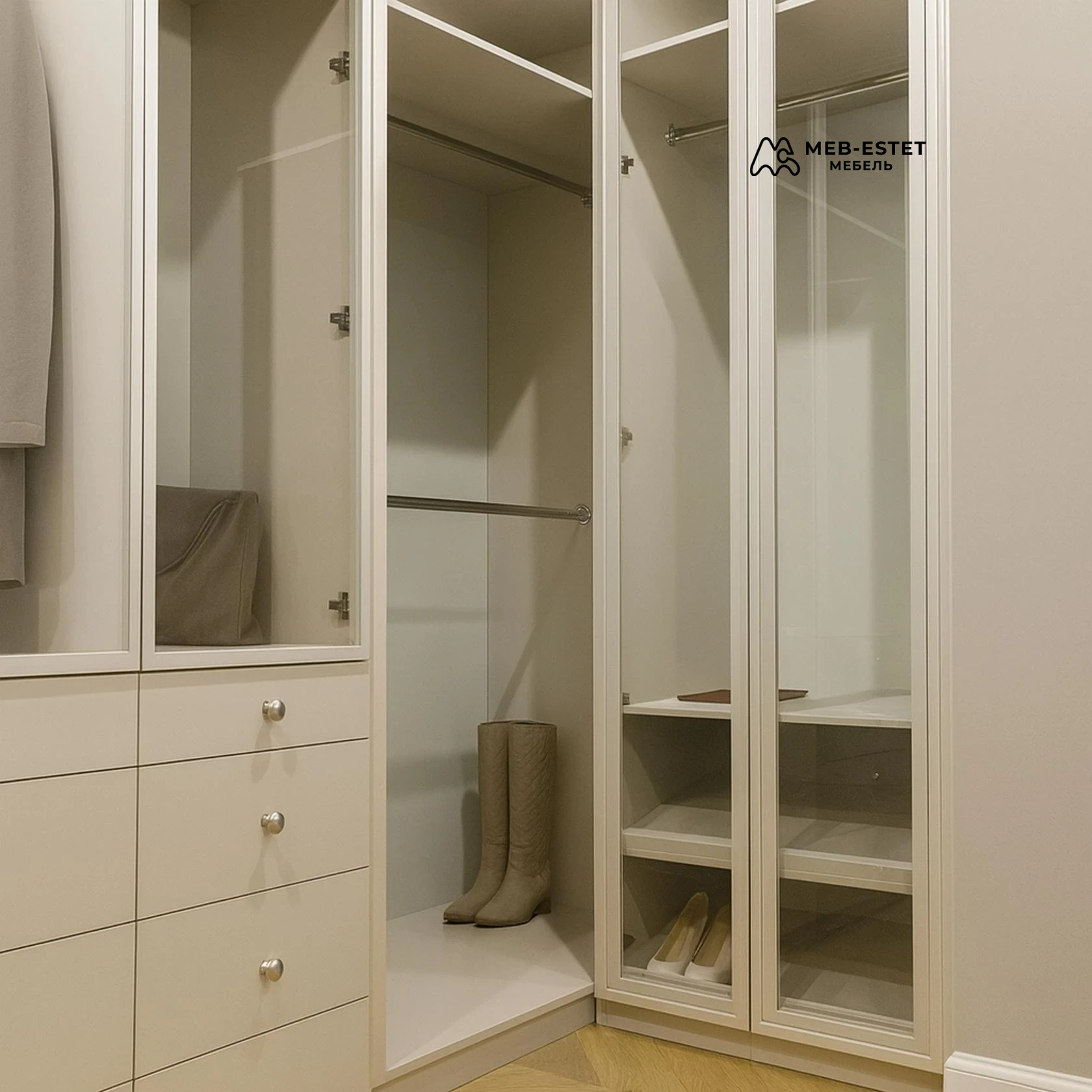 Индивидуальная встроенная гардеробная премиум-класса с витринами и выдвижными ящиками. Выполнена в светлой кремовой гамме, сочетает рамочные фасады и стеклянные вставки для аккуратной экспозиции вещей.