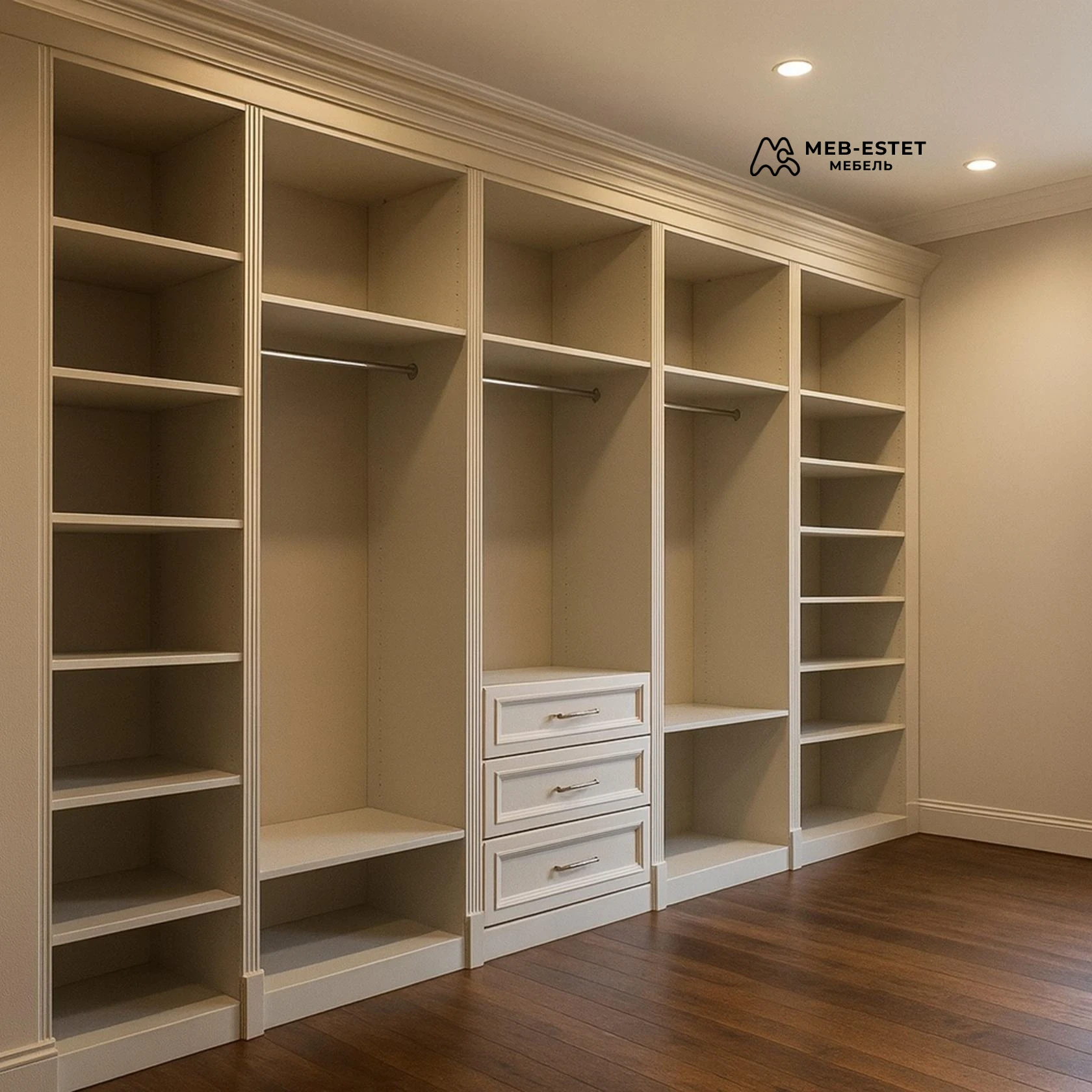 Индивидуальная встроенная гардеробная премиум-класса в светлом кремовом оттенке. Продуманная организация хранения: открытые полки, нишы для штанг и набор выдвижных ящиков с аккуратными рамочными фасадами.