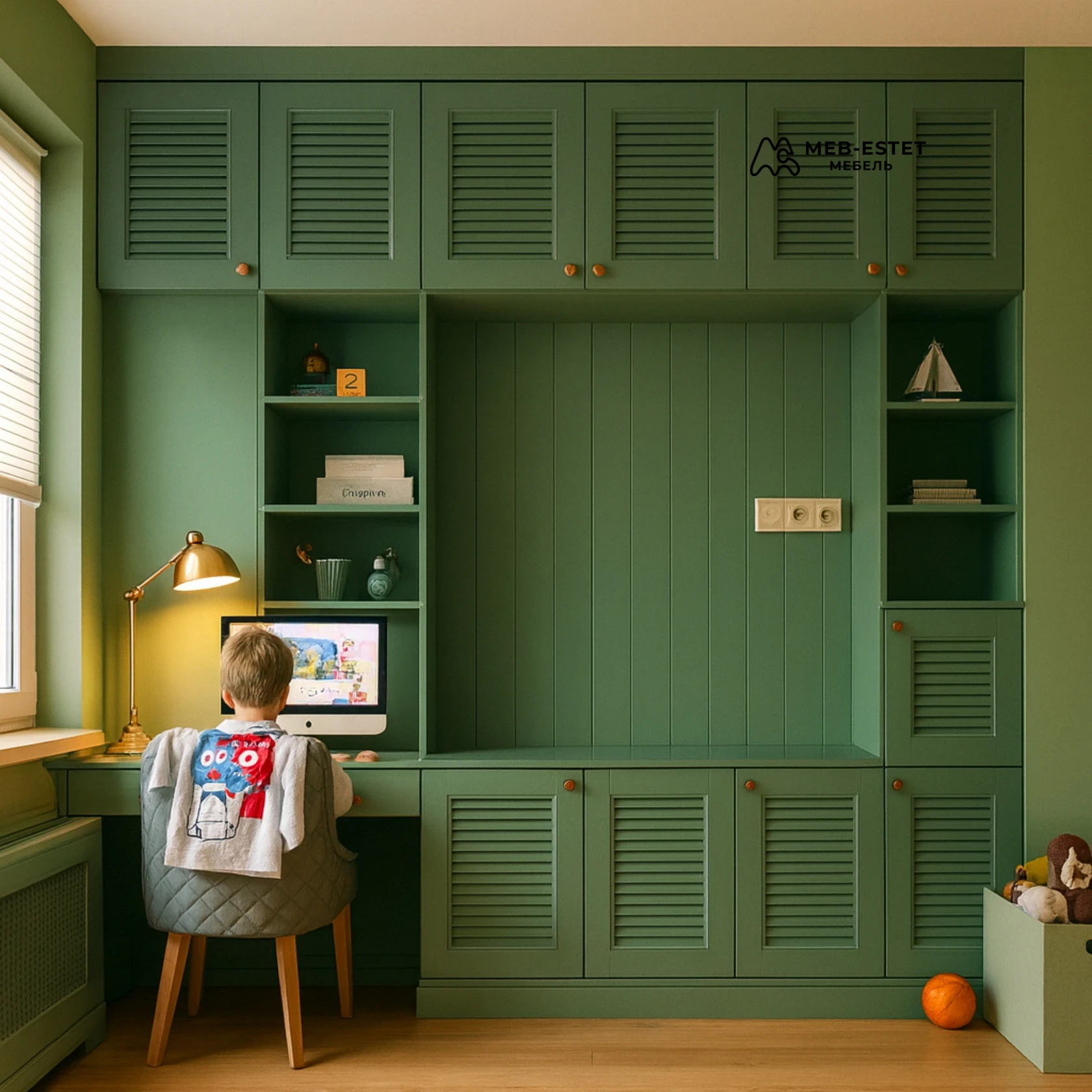 Премиальная встроенная мебель под заказ: рабочая зона с открытыми полками, нишей для сидения и жалюзийными фасадами. Идеально для детской и кабинета — сочетает хранение и место для учёбы.