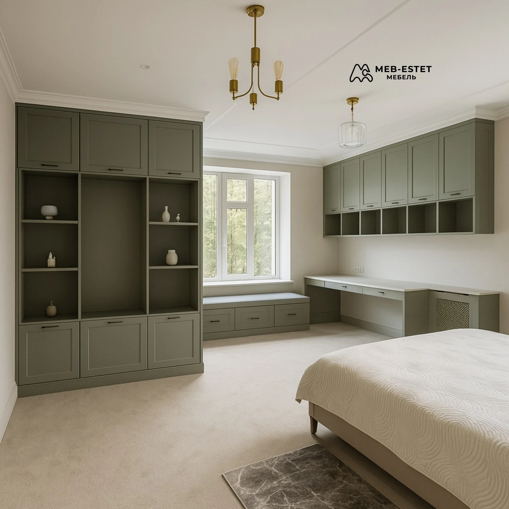 Комплексная встроенная мебель премиум-класса: комбинированный шкаф с открытыми нишами, скамья у окна с выдвижными ящиками и рабочая зона со встроенными навесными шкафами. Изделие изготовлено на заказ по индивидуальным размерам, с фрезерованными МДФ-фасадами в матовом зелёном тоне.