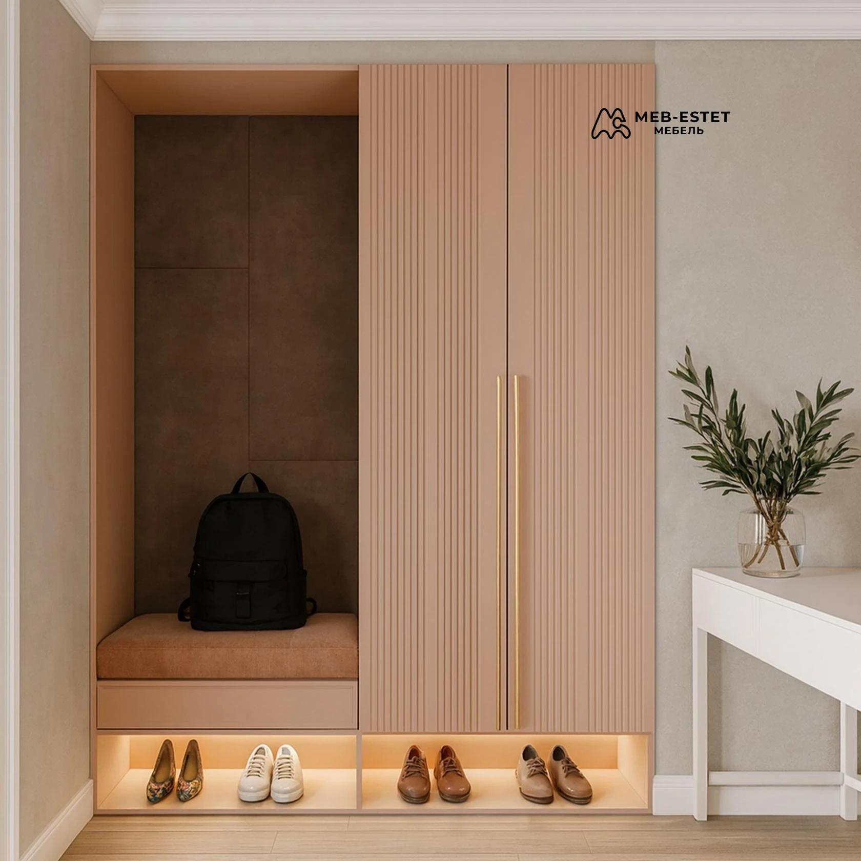 Компактная встроенная прихожая с мягкой банкеткой и открытыми подсвеченными полками для обуви. Фасады выполнены из МДФ с вертикальной рейкой, матовая отделка в тёплых тонах и тонкие латунные ручки подчёркивают премиум-стиль.