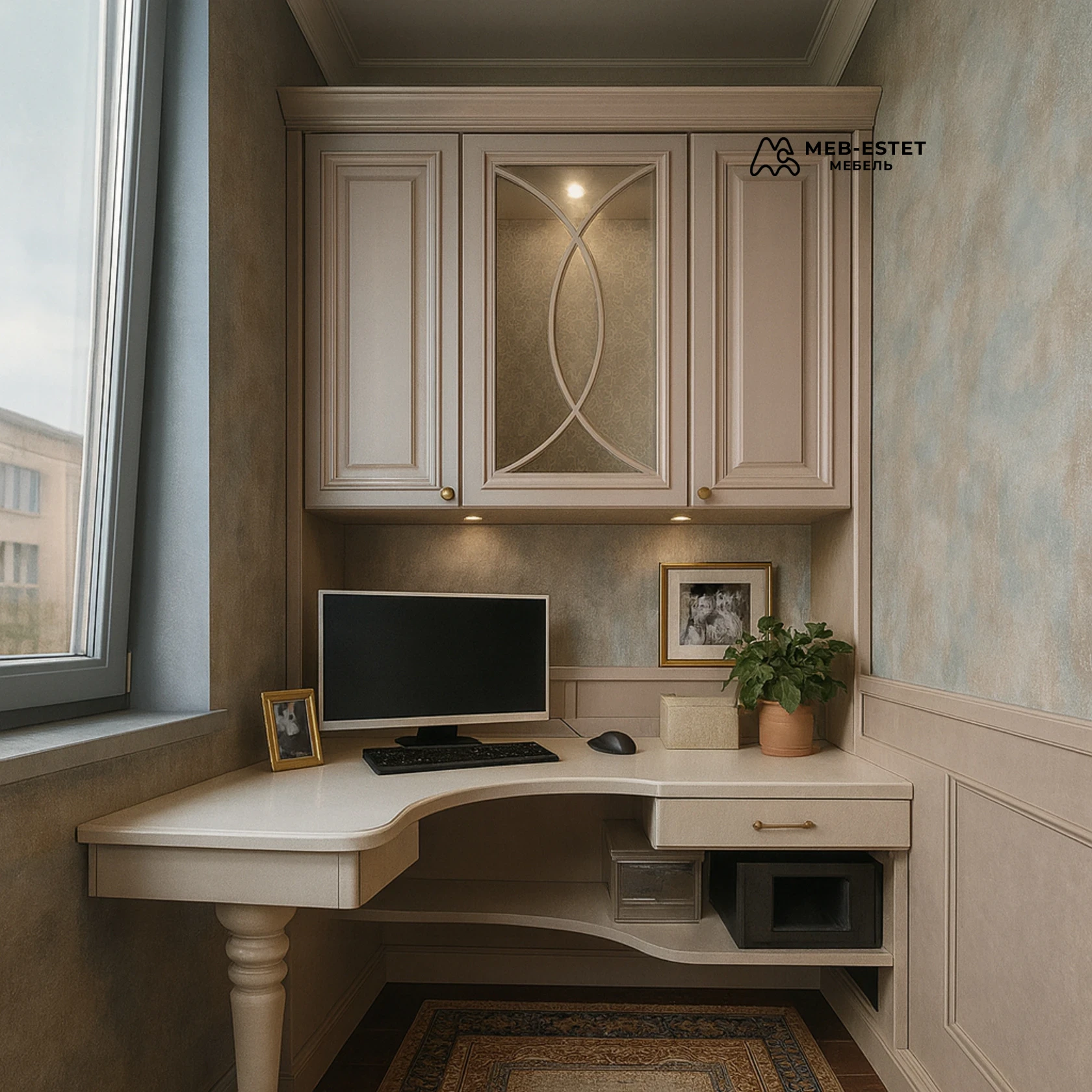 Классическая встроенная рабочая зона премиум-класса, выполненная на заказ по индивидуальным размерам. Решение сочетает рабочий стол с выдвижным ящиком и навесными шкафами с декоративными филёнками и витражным стеклом.