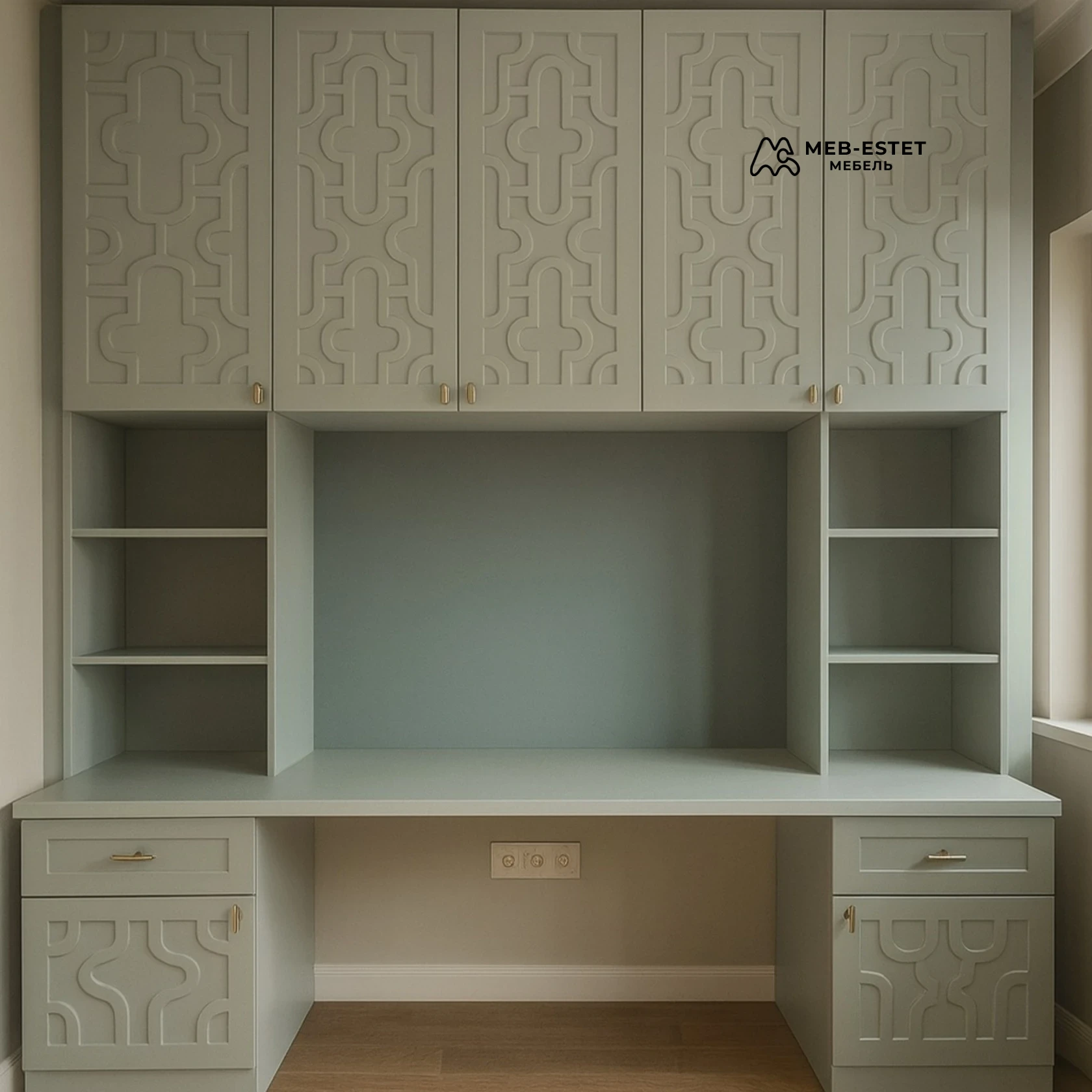 Элегантная встроенная рабочая зона с антресолями — решение для кабинета или спальни. Корпус и фасады выполнены из МДФ с фрезеровкой и матовой эмалью; декоративные панели придают объёму и глубине. Продуманная столешница с кабель-выводом, антресоли для сезонных вещей и открытые полки для книг.