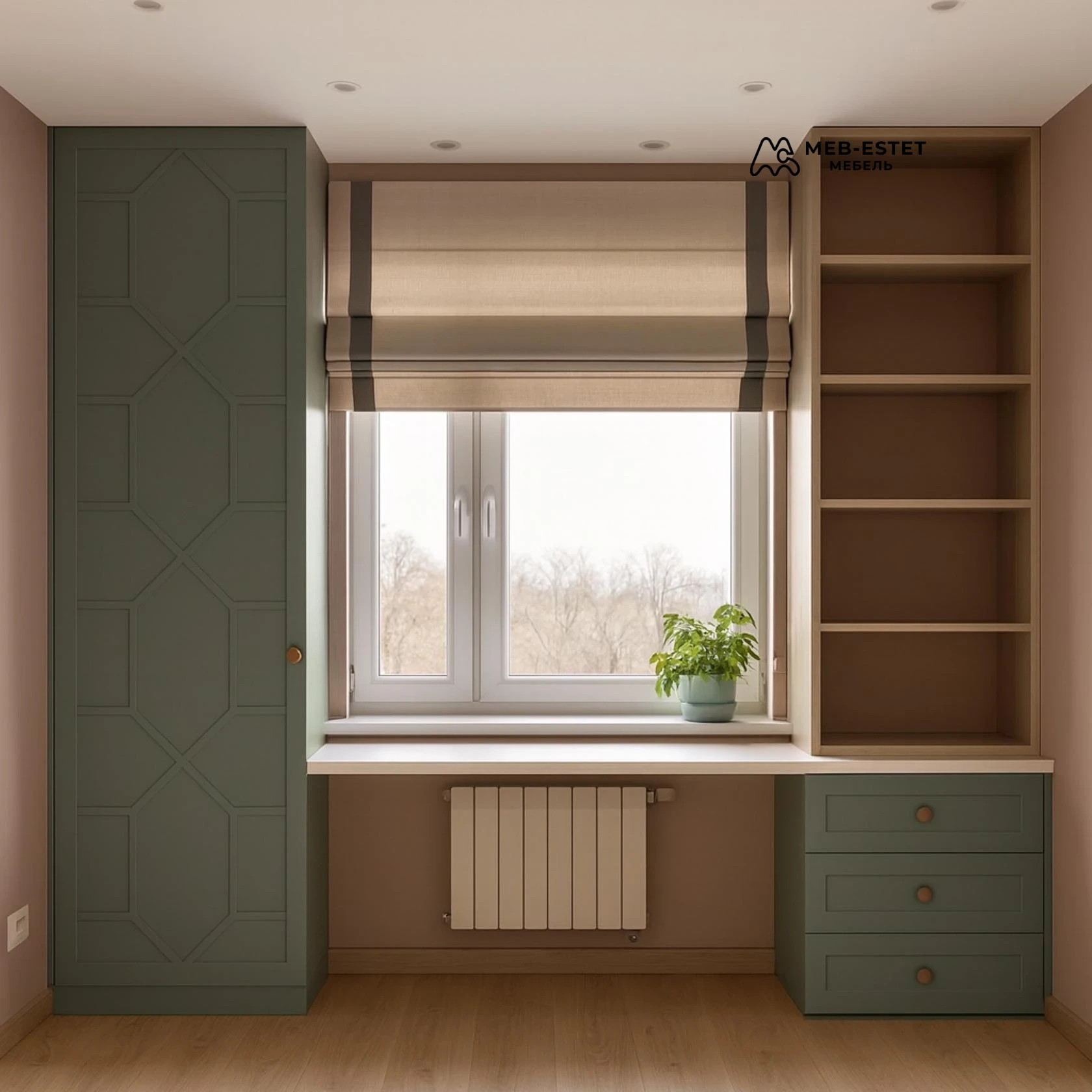 Компактная встроенная рабочая зона под окно с пеналом и открытыми полками. Изделие выполнено на заказ из МДФ с шпоновой отделкой: матовые фрезерованные фасады и лаконичная столешница создают премиальный, но спокойный образ.