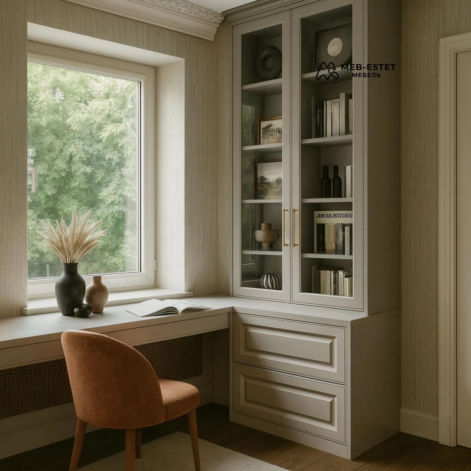 Элегантная встроенная рабочая зона с витриной — решение премиум-класса для кабинета или спальни. Изготовление по индивидуальным размерам, крашеный МДФ и стеклянные фасады создают спокойный неоклассический образ.