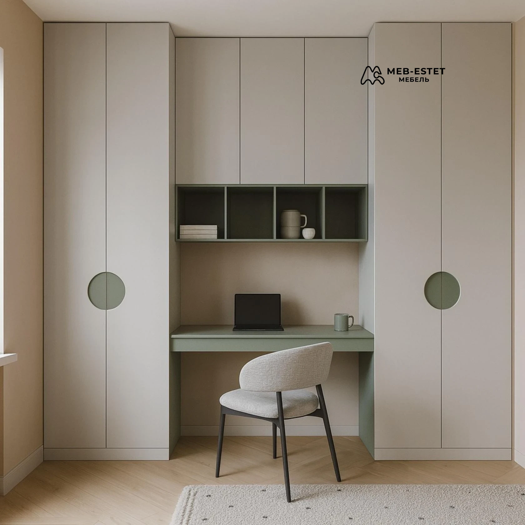 Комплект встроенной мебели с рабочей зоной и высокими пеналами — идеальное решение для кабинета или спальни. Выполнен из качественных материалов по индивидуальным размерам, с аккуратными бесшовными фасадами и скрытыми ручками.