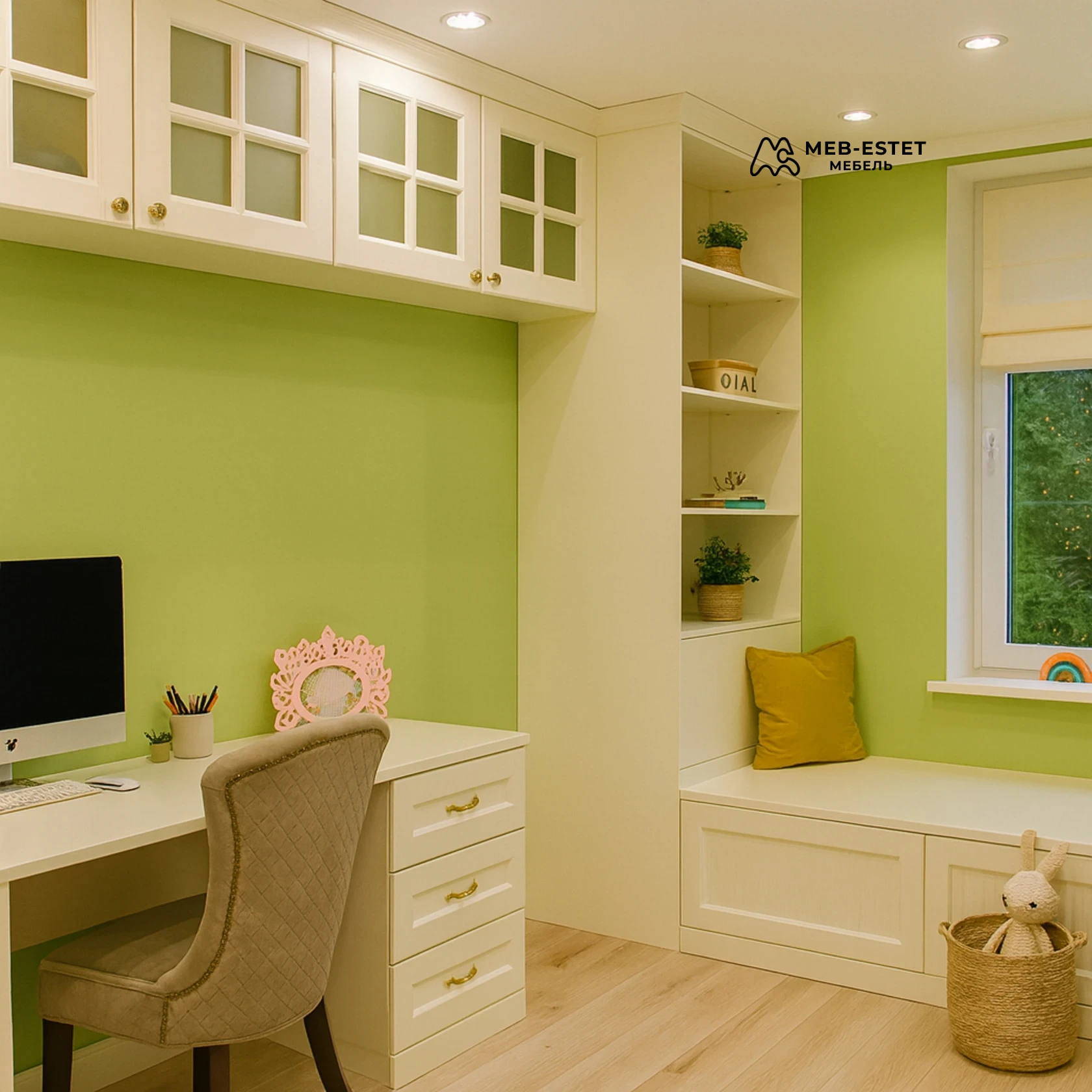 Индивидуальная встроенная рабочая зона с местом для сидения и системой хранения. Изготовлена из МДФ с матовой покраской и стеклянными вставками — сочетается с мягкими пастельными тонами интерьера.
