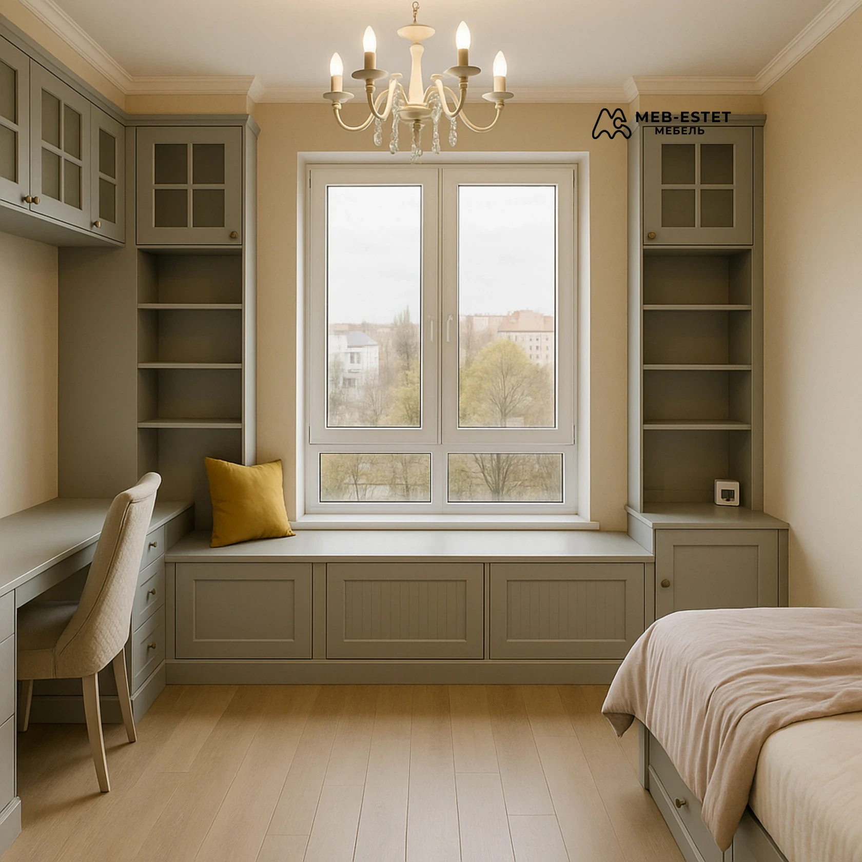 Комплексная встроенная мебель для спальни: окно с сиденьем, тумбы и открытые полки по бокам, рабочая зона со столом. Изготовлено по индивидуальным размерам, с акцентом на премиальное исполнение и долговечные материалы.