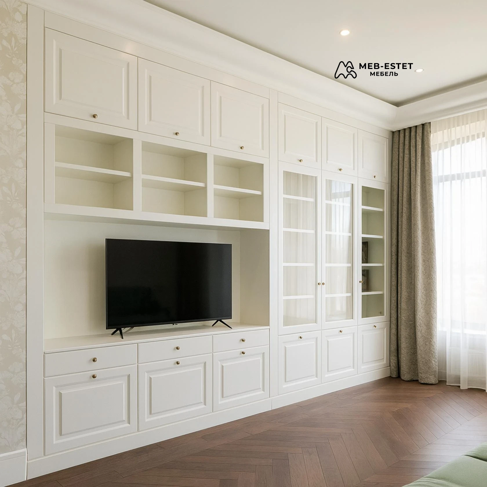 Встроенная стенка премиального уровня в неоклассическом стиле. Универсальная композиция включает нишу под ТВ, открытые полки, витрины со стеклом и нижние шкафы с ящиками — функциональное решение для гостиной.