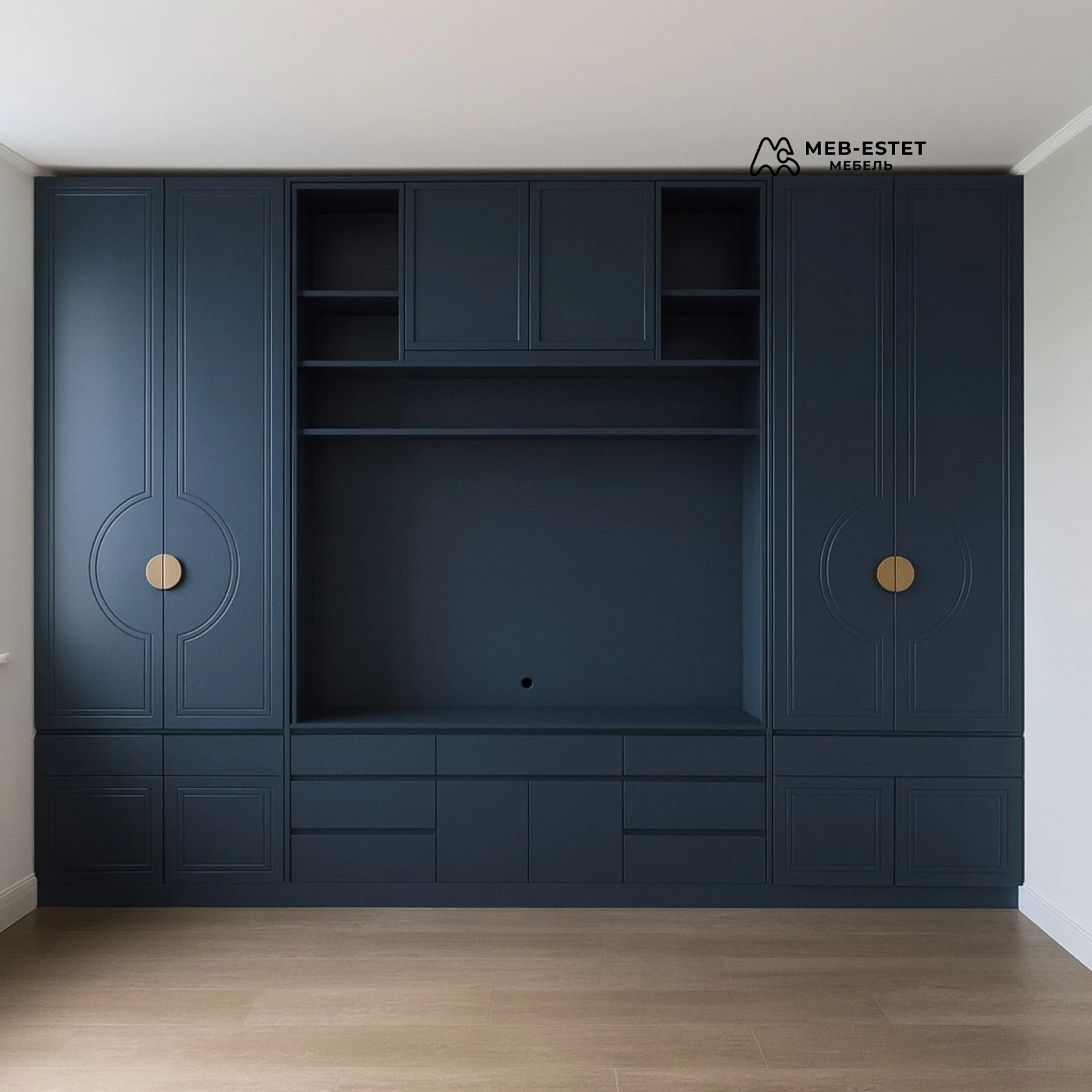 Стенная встроенная мебель премиум-класса: глубокая ниша под телевизор, открытые полки и выдвижные ящики в основании. Корпус и фасады — окрашенный МДФ, фрезеровка по фасаду и крупные латунные рукояти подчеркивают неоклассический характер.