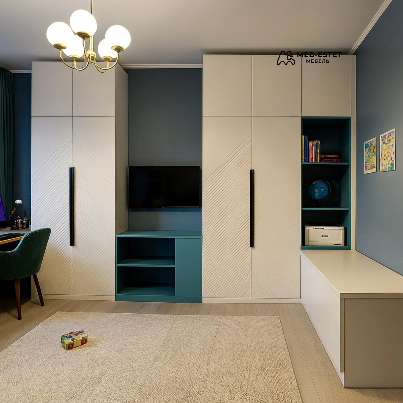 Элегантная встроенная стенка с двумя высокими гардеробными пеналами и центральной нишей под ТВ. Фасады — фрезерованная МДФ-панель в светлом тоне, контрастные открытые полки и тумба в глубоком бирюзовом оттенке.