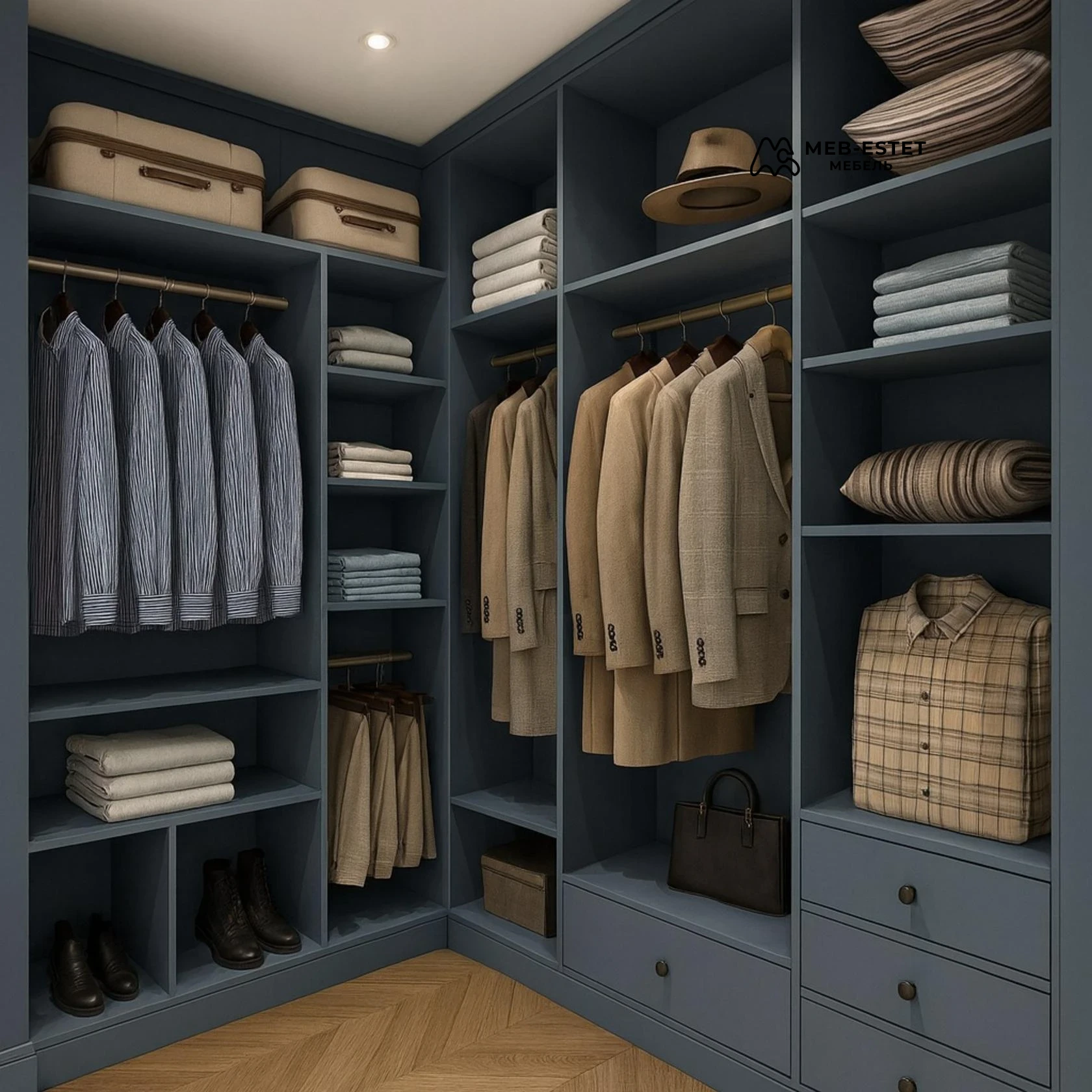 Угловая встроенная гардеробная премиум-класса, выполненная под индивидуальные размеры. Матовая окраска МДФ в глубокий серо‑синий оттенок, продуманная система хранения: открытые секции, выдвижные ящики и штанги для костюмов.