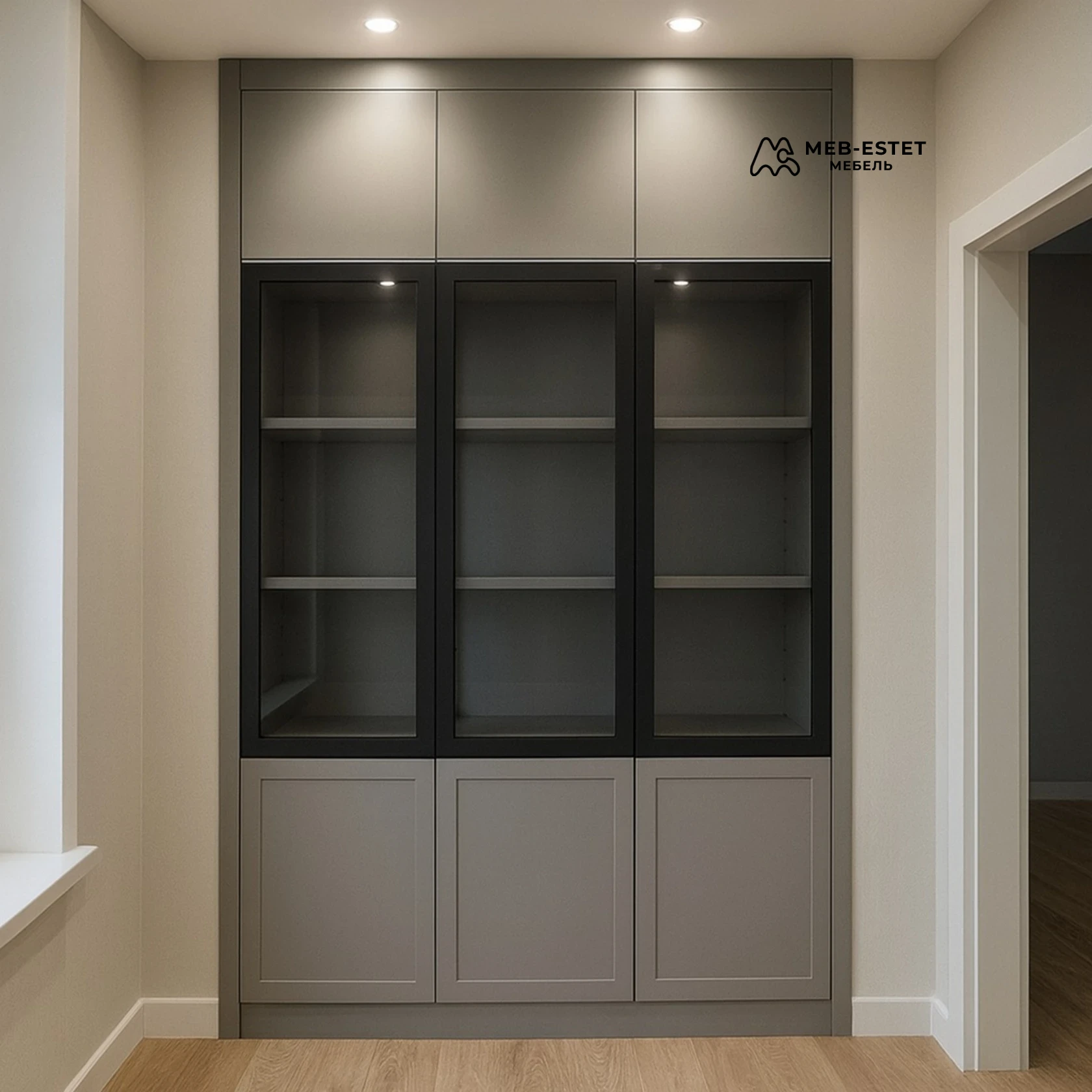 Встроенная витрина премиум-класса — продуманное решение для гостиной или прихожей. Корпус и филёнчатые дверцы выполнены из МДФ в матовойгрей-палитре, верхние секции с закалённым стеклом в алюминиевом профиле подчёркивают графичность фасада.