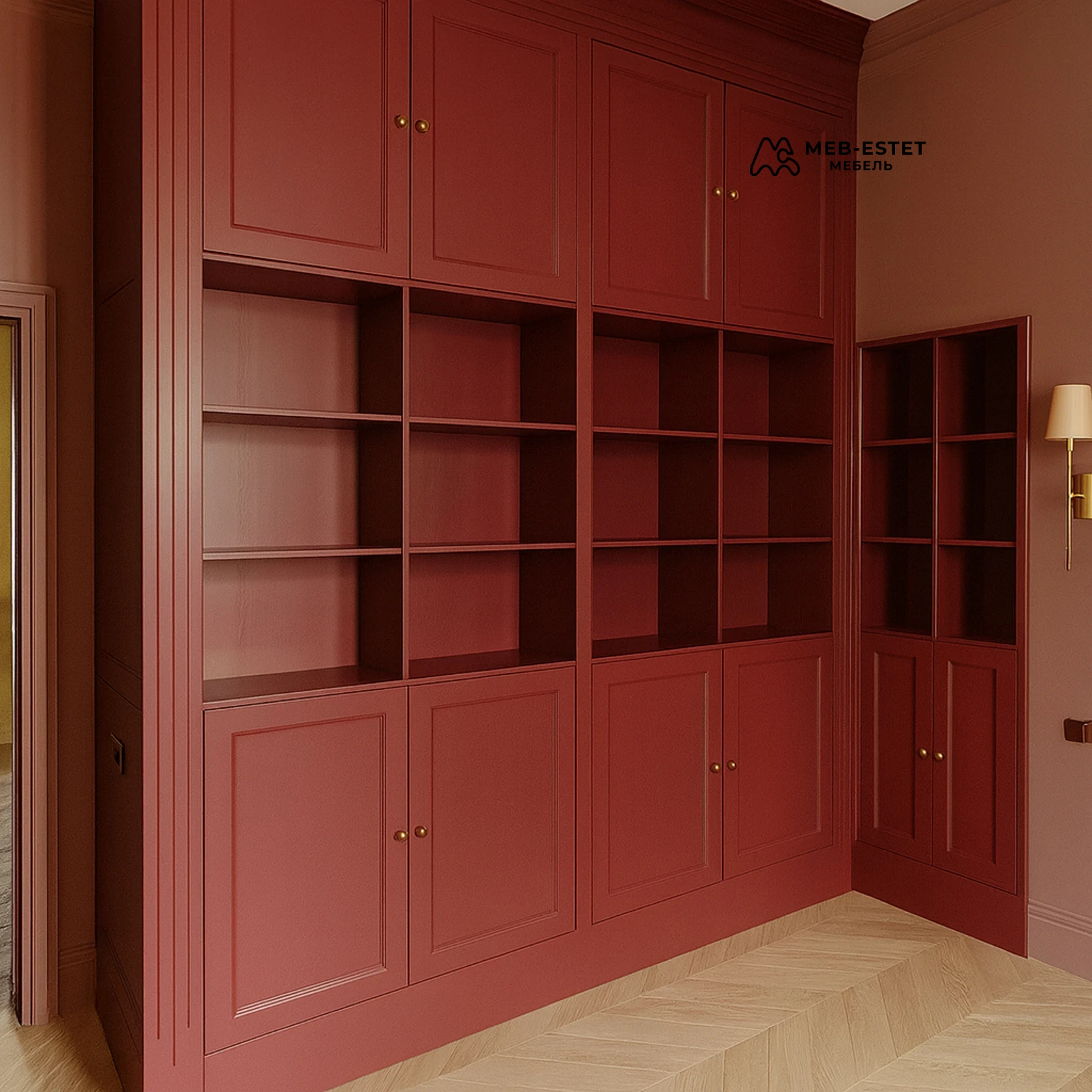 Премиальная встроенная библиотечная мебель в неоклассическом стиле: сочетание открытых стеллажей и закрытых распашных секций для аккуратного хранения. Корпус и фасады — окрашенный МДФ с фрезеровкой, классические панельные дверцы и латунные ручки.