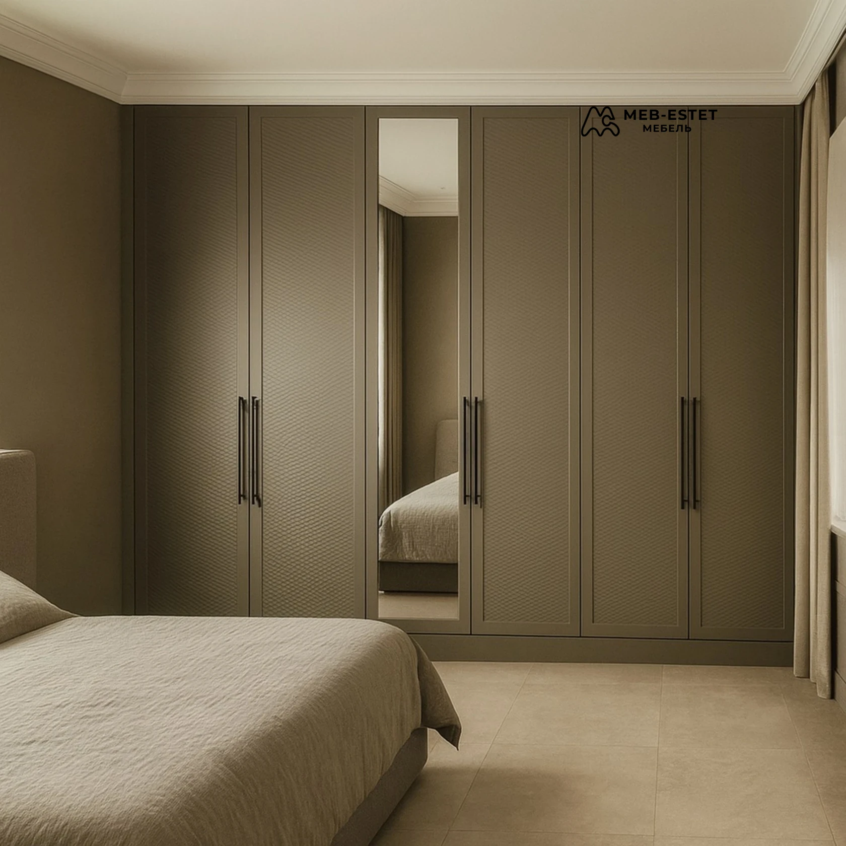 Встроенный платяной шкаф премиум-класса, выполнен в спокойной коричнево-бежевой гамме с центральной зеркальной дверью и текстурной фрезеровкой фасадов. Длинные вертикальные ручки подчеркивают вертикаль и удобство доступа.