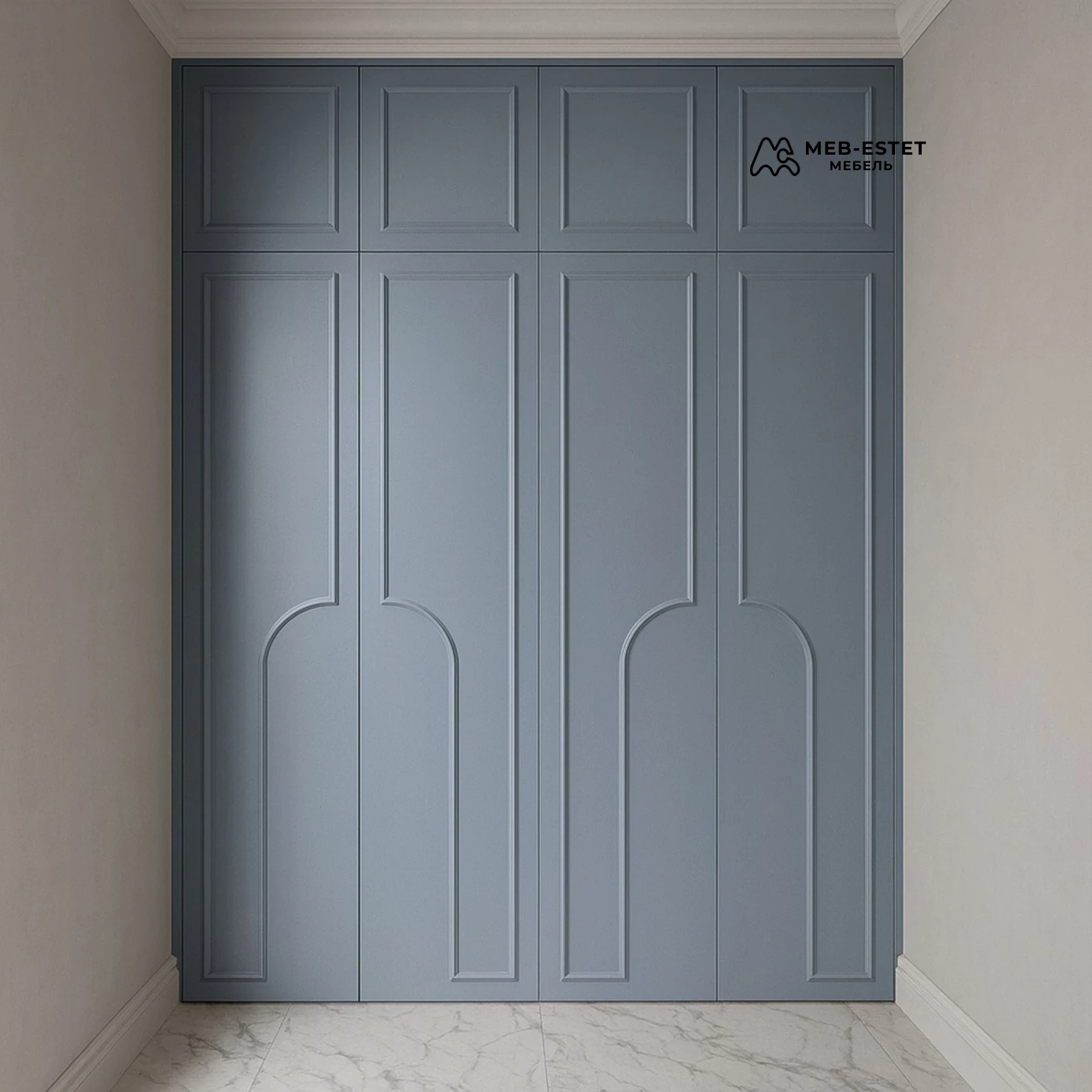 Встроенный платяной шкаф в неоклассическом стиле — премиальное решение под индивидуальные размеры. Корпус и фасады — рамочный МДФ с фрезеровкой и матовой эмалевой окраской, аккуратно интегрированный до потолка.
