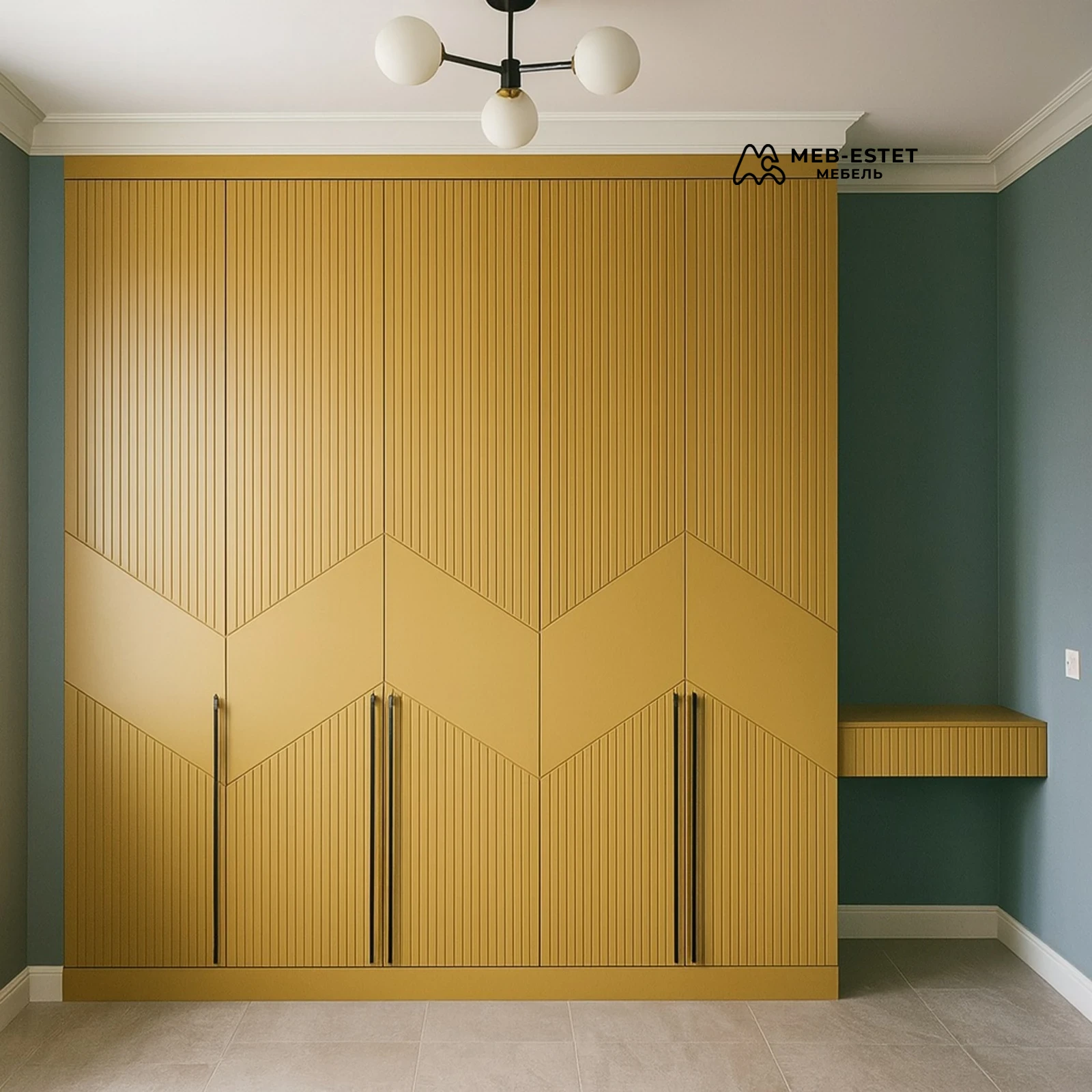 Элегантный встроенный платяной шкаф с акцентом на функциональную эстетику. Фасад выполнен в рифлёной рейке и гладких геометрических вставках, покрытие эмаль по МДФ обеспечивает ровный тон и долговечность.