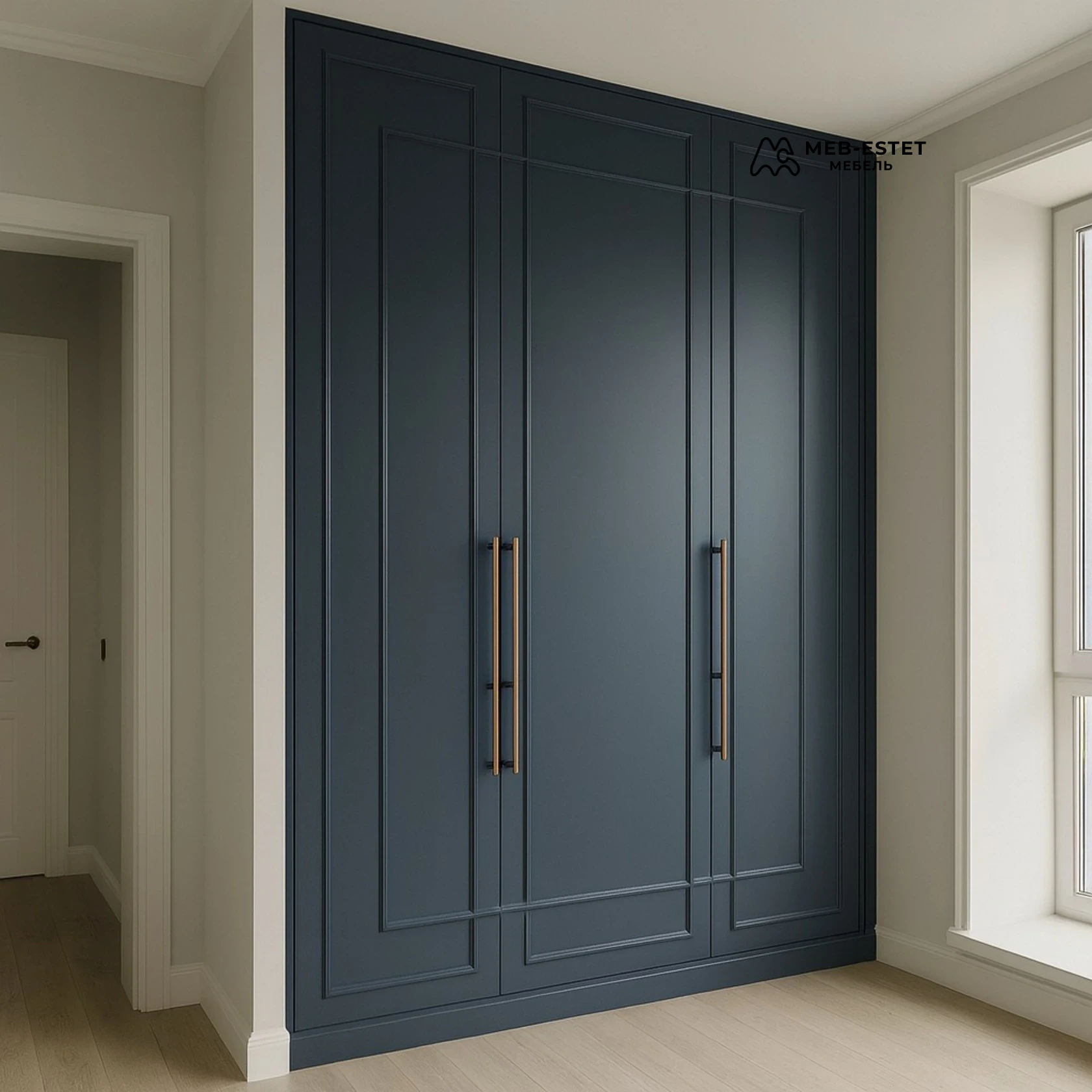 Встроенный платяной шкаф премиум-класса, изготовлен по индивидуальным размерам. Фасады — окрашенный МДФ с фрезеровкой, матовый эмалевый финиш; декоративные рамки придают глубину и классический характер. Двери распашные на скрытых петлях с доводчиками, длиные бронзовые ручки — акцент в интерьере.