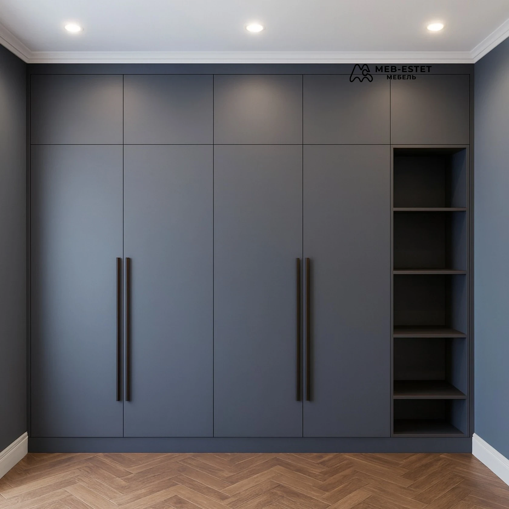 Элегантный встроенный распашной шкаф премиум-класса в тёмно-сером матовом покрытии. Чёткая геометрия фасадов, длинные вертикальные ручки и открытая секция полок делают модель функциональной и визуально лёгкой.