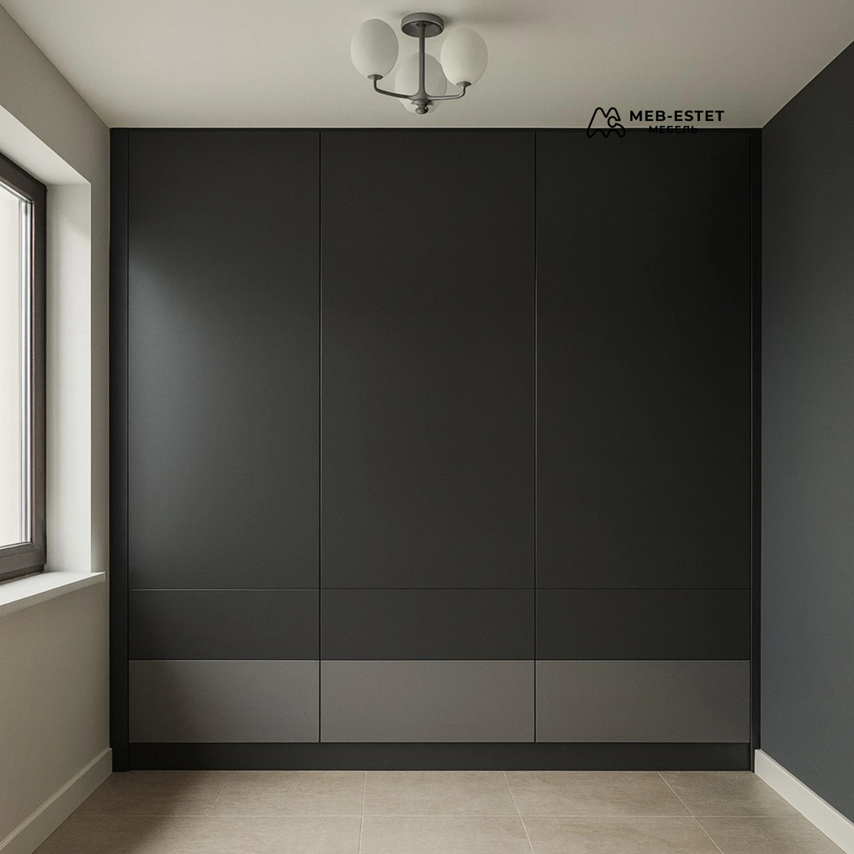 Современный встроенный распашной шкаф премиум-класса в лаконичном матовом исполнении. Фасады — МДФ с эмалевым покрытием, фрезеровка вместо ручек для бесшовного вида. Низ — функциональные выдвижные ящики на полных направляющих.