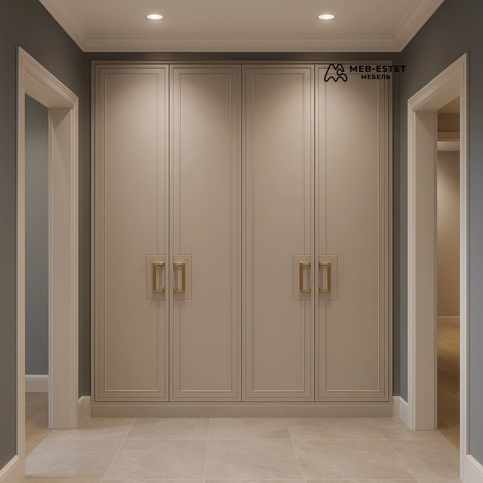 Встроенный распашной шкаф в неоклассическом стиле, выполнен в матовой кремовой эмали на МДФ. Панельные фасады с фрезеровкой и аккуратной рамочной раскладкой создают спокойную, выдержанную эстетику. Ручки в квадратной золотистой отделке усиливают премиальный характер изделия.