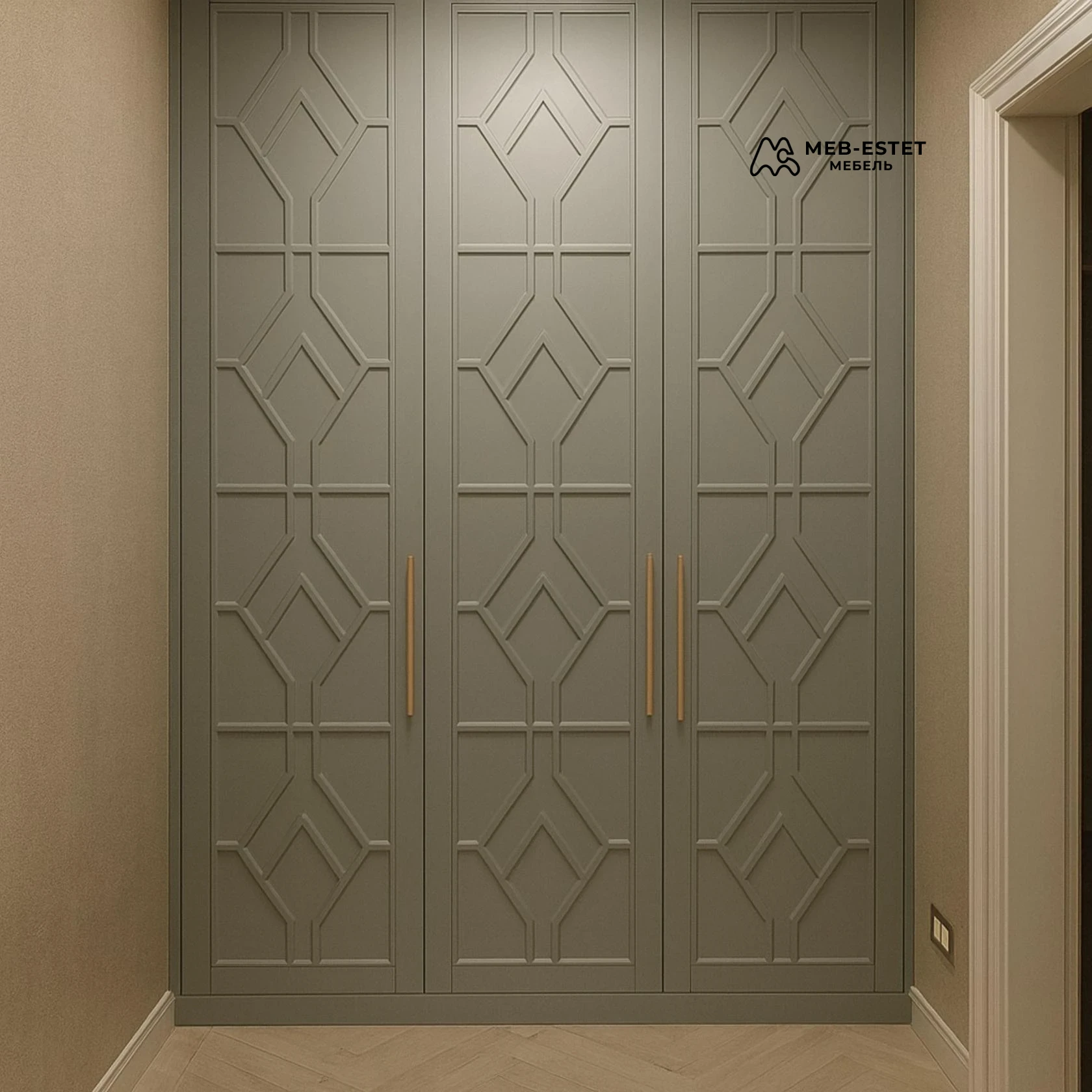 Встроенный распашной шкаф по индивидуальным размерам, выполнен из окрашенного МДФ с фрезерованным геометрическим декором на фасадах. Матовая поверхность и тонкие золотистые ручки придают изделию сдержанную премиальность.