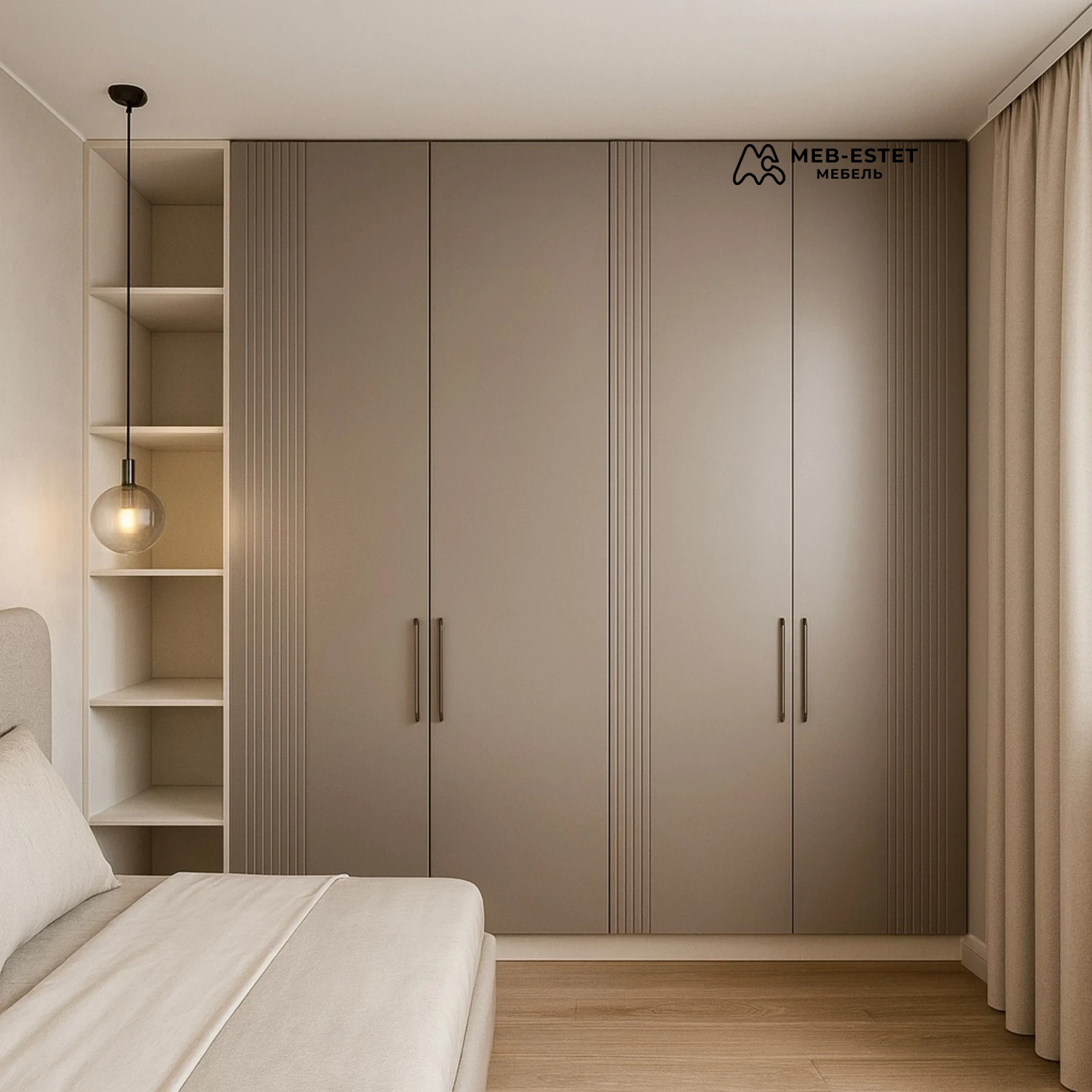 Встроенный распашной шкаф для спальни в современном стиле. Фасады выполнены из МДФ с матовой эмалью и тонкой фрезеровкой в виде вертикальных рёбер, что добавляет фактуры без перегрузки интерьера. Узкая открытая секция слева служит как стеллаж для книг и декора.
